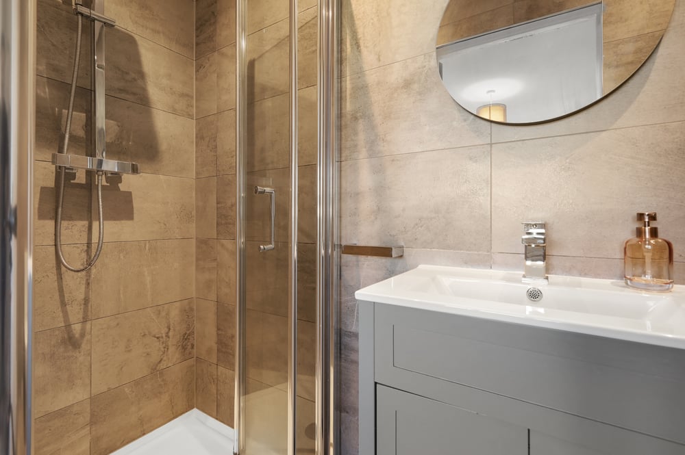 Tiled walls, inset spot lights, low level WC, vanity unit, shower cubicle, radiator.