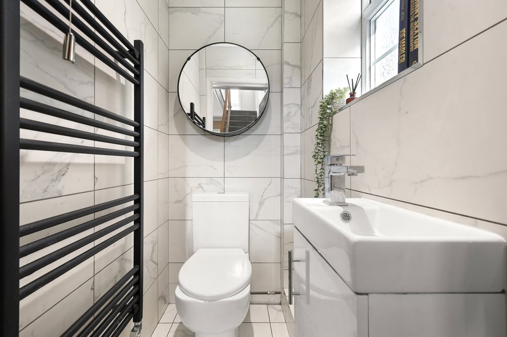 Obscure window to side, heated towel rail, tiled walls, vanity wash hand basin with storage, close coupled WC.
