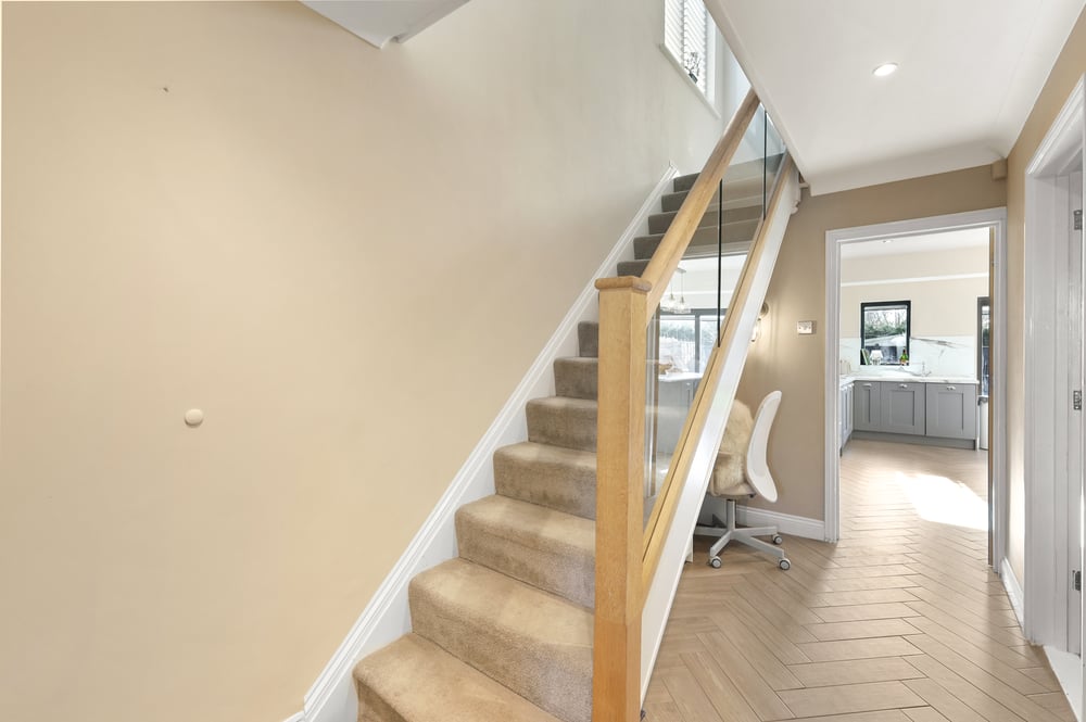 Entrance door, stairs rising to the first floor landing, radiator, space for office area