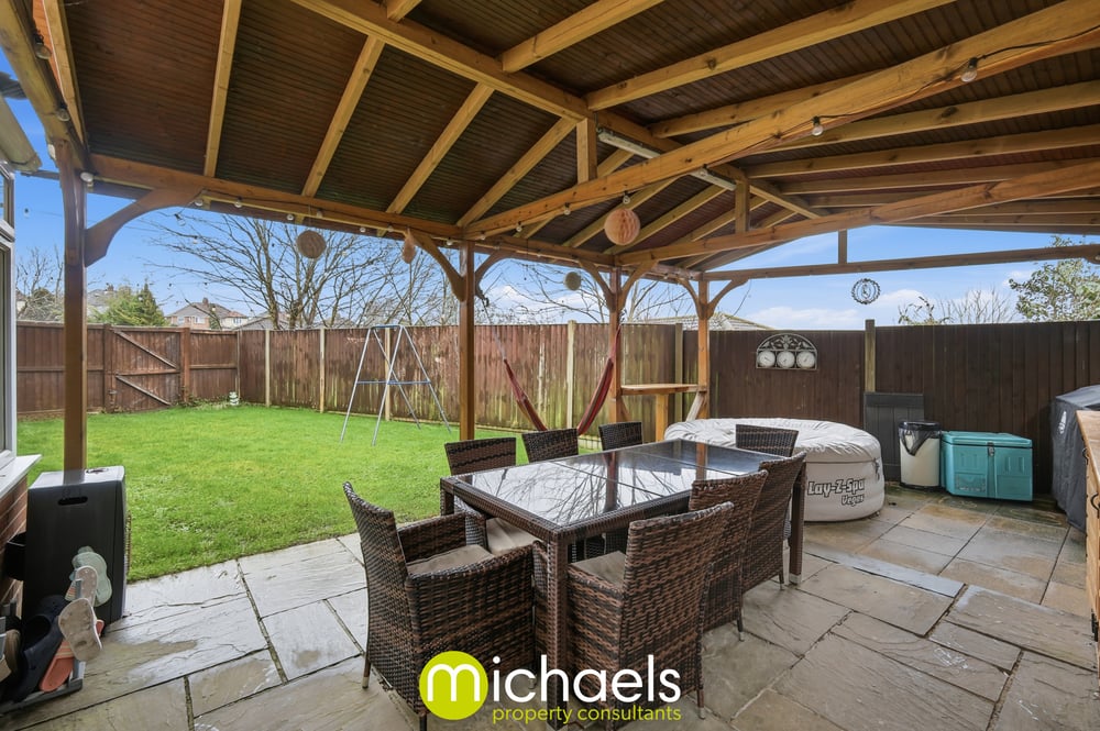 The exterior of the home is equally impressive. A private driveway offers off-road parking for two vehicles with ease, while the garden wraps around the property, creating an excellent outdoor environment. Designed with entertaining in mind, the garden features a pergola, alongside a detached home office or studio with additional storage space.
