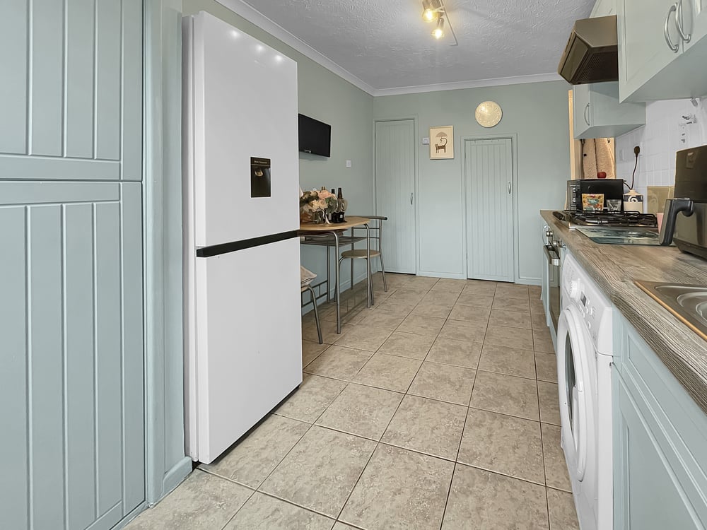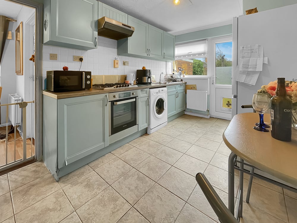 13' 0" x 8' 4" (3.96m x 2.54m) Window and glazed door to rear tiled floor, radiator, fitted cupboards, under stairs cupboards, a range of fitted units and drawers with worktops over, inset sink and drainer, inset gas hob, fitted oven, space and plumbing for appliances, tiled splashback, matching eye level units, extractor.