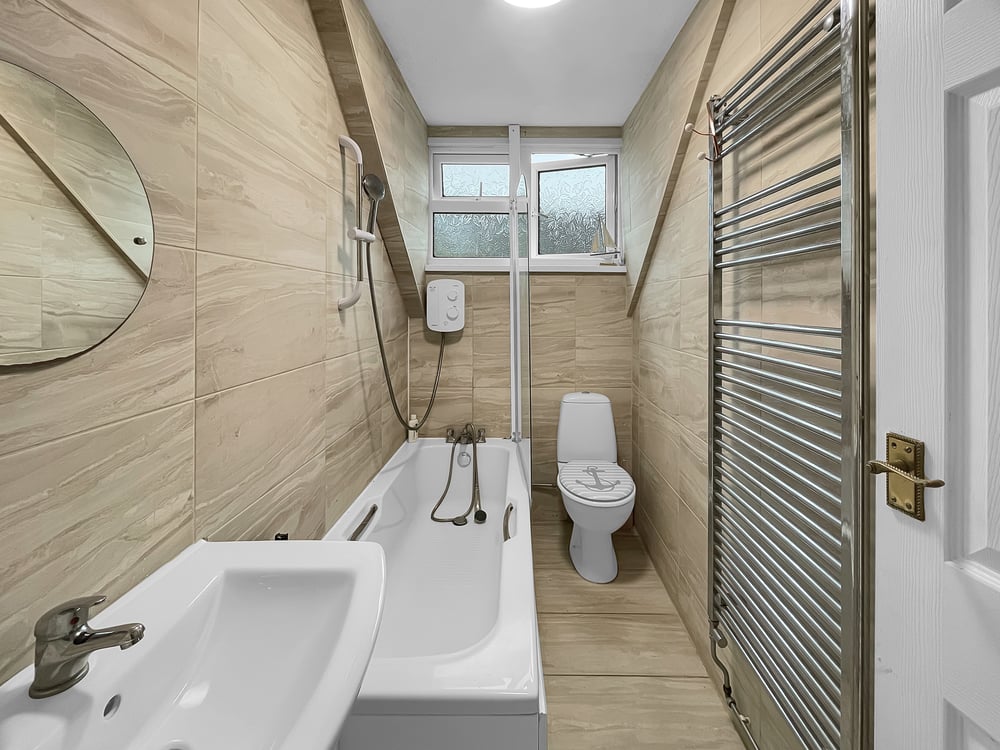 Obscure window to side, panel bath with screen and shower over, close coupled WC, pedestal wash hand basin, heated towel rail, tiled floor and walls.
