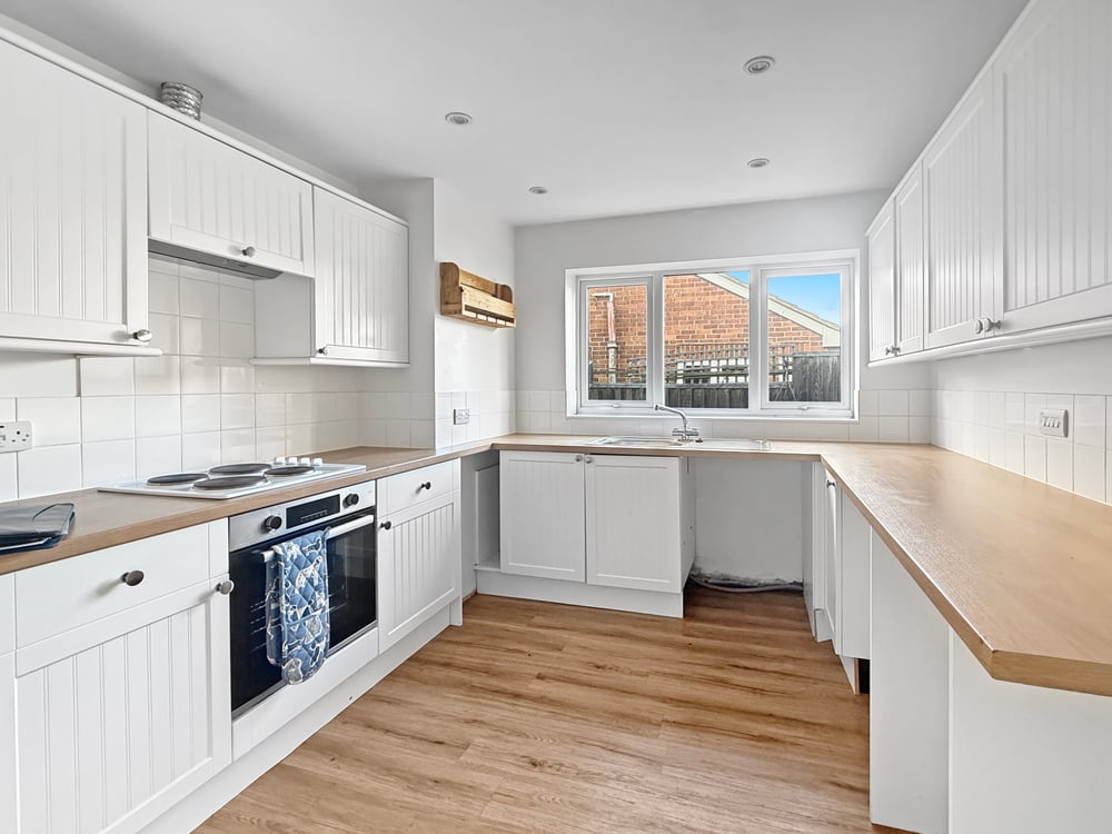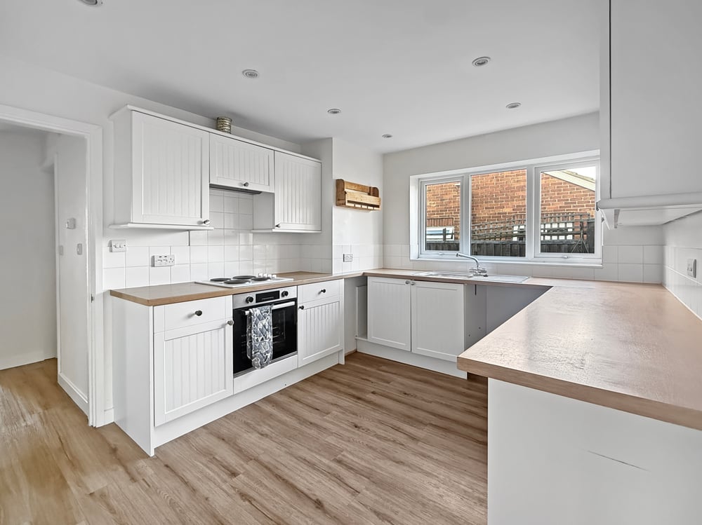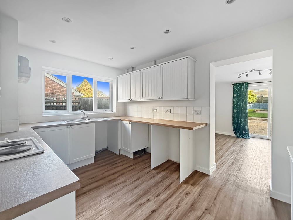 12' 0" x 9' 09" (3.66m x 2.97m) Inset spot lights, double glazed window to side, radiator, fitted kitchen including a range of wall and base units, tiled splash back, integrated electric hob, oven, stainless steel sink, right hand drainer, space for washing machine, fridge/freezer and dish washer.