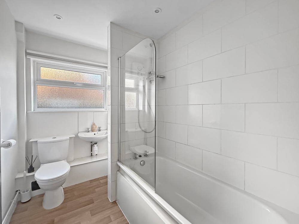 Double glazed obscure window to side, inset spot lights, part tiled walls, towel radiator, low level WC, wash hand basin, paneled bath with over head shower.
