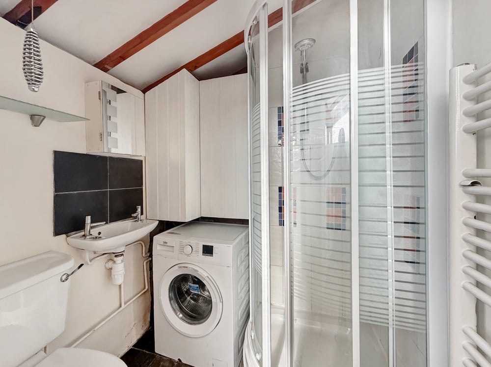 Towel radiator, WC, wall hung basin with tiled splash back, shower encloser, space for washing machine.