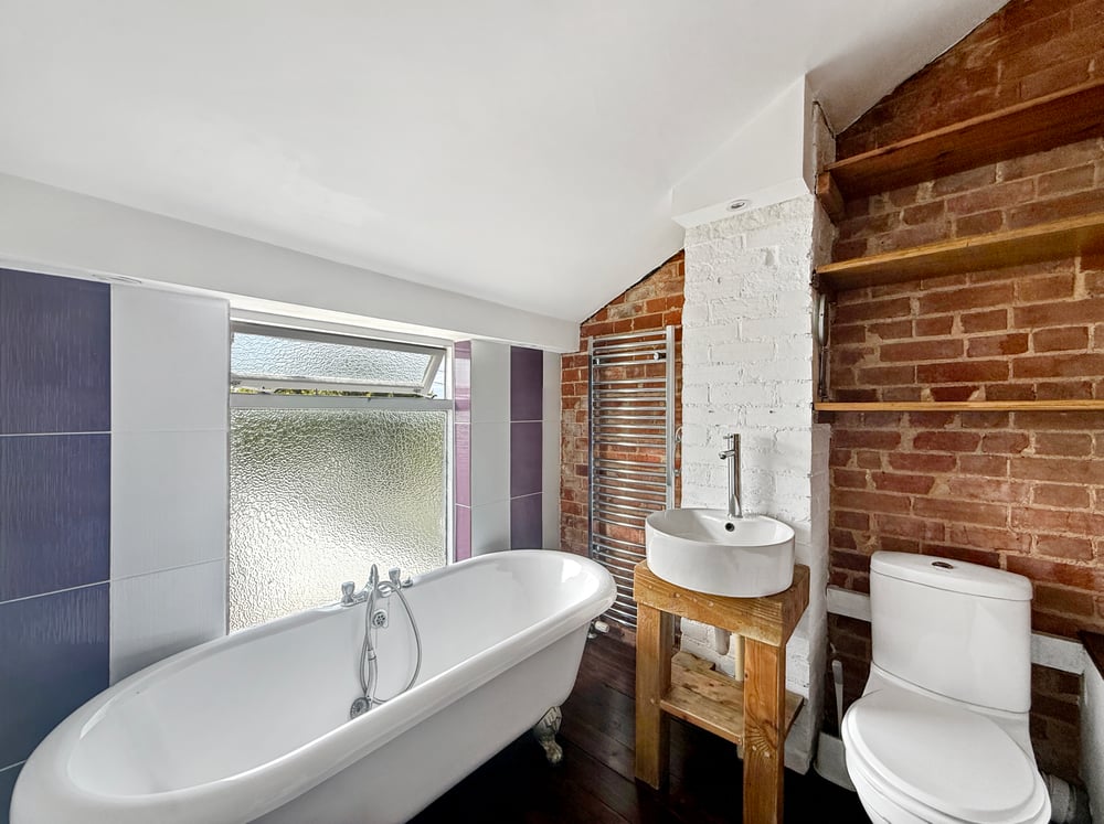 Obscure window to rear, tiled floor, part tiled walls, towel radiator, free standing bath, WC, basin.