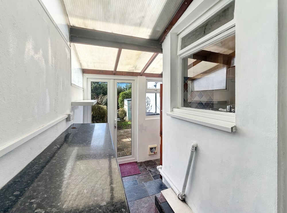 12' 0" x 6' 5" (3.66m x 1.96m) French doors opening onto the rear garden, laminate worktop, space for fridge/freezer, wall light.