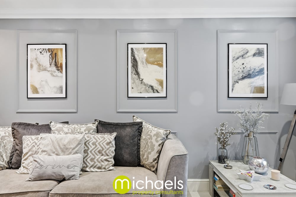 The accommodation begins with an entrance porch, ideal for storing shoes, coats, boots and prams. This leads into a well-proportioned living room featuring stylish wall panelling, inset spotlights and LVT flooring. The living room opens into the kitchen, creating a modern open-plan feel. The kitchen is finished in high-gloss grey units with a tiled splashback, space for appliances and access to the rear garden. Upstairs, the main bedroom offers ample space for free-standing furniture, while bedroom two also benefits from feature wall panelling and is ideal as a guest room or home office. The first-floor bathroom is modern in style and includes a shower over bath and vanity basin.