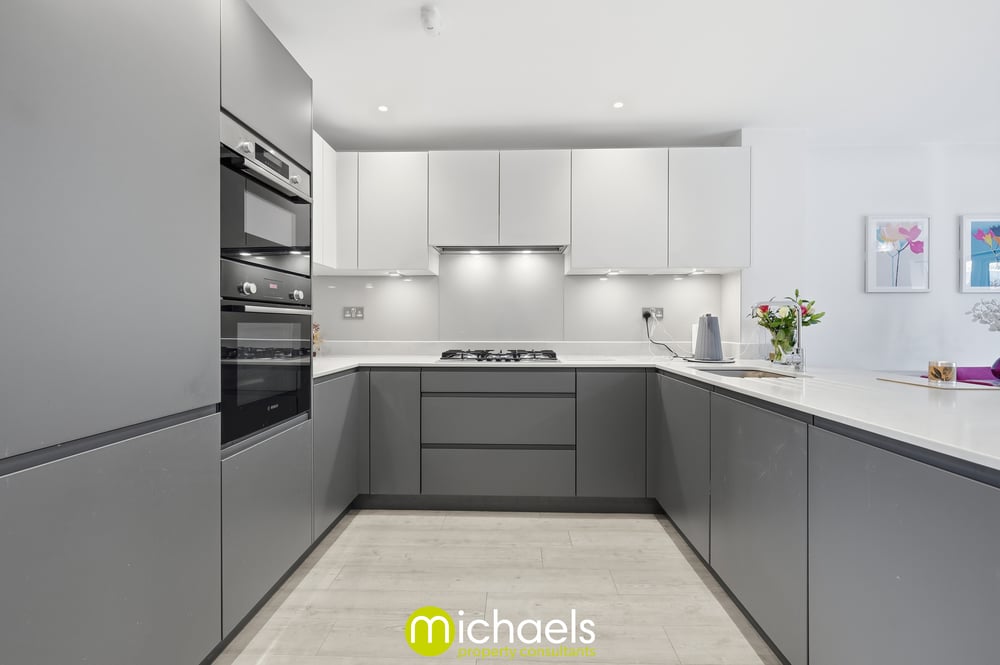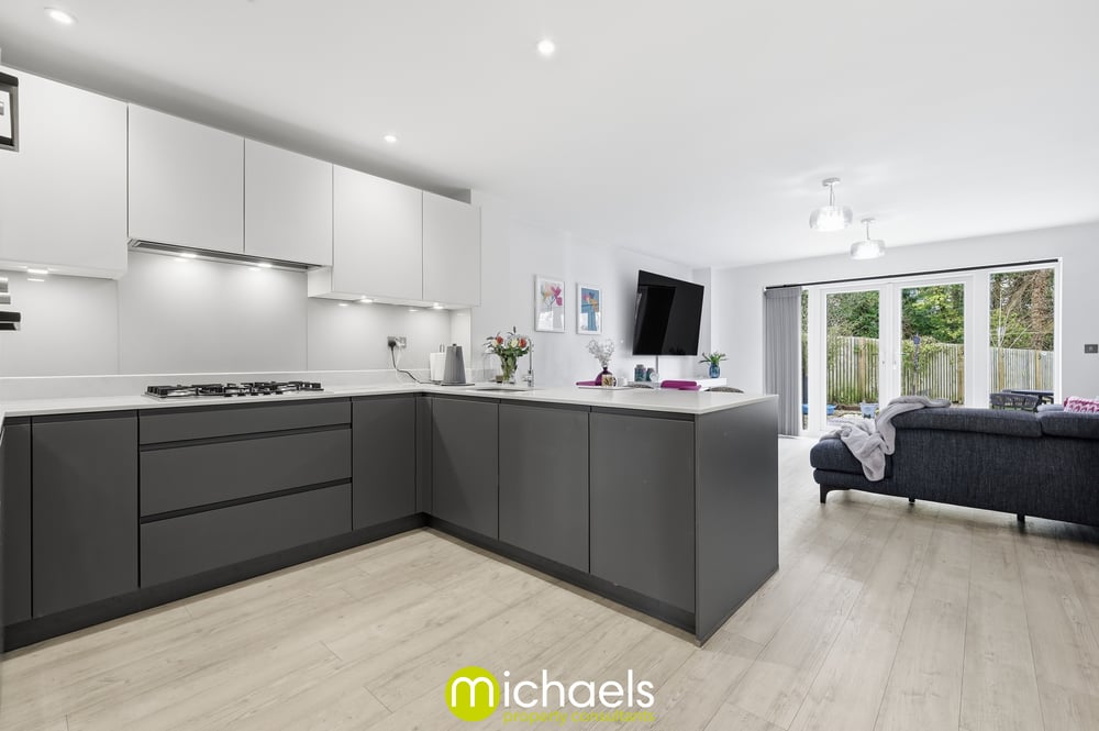 The focal point of the home is the impressive open-plan kitchen/dining/living space, perfectly suited to modern living, entertaining and hosting. The contemporary kitchen features sleek units, stone work surfaces, integral appliances and under-counter lighting. The space is flooded with natural light via patio doors opening onto the rear garden, and also benefits from useful understairs storage.