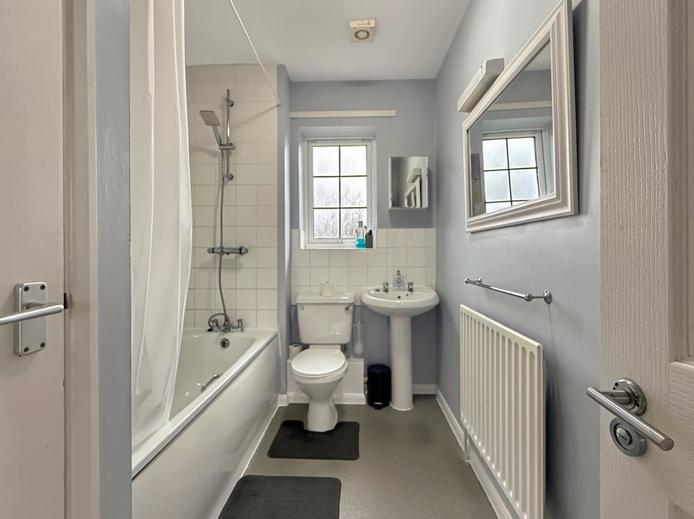 Upstairs, the property offers two large double bedrooms, with the second bedroom benefitting from fitted wardrobes, along with a first-floor family bathroom.