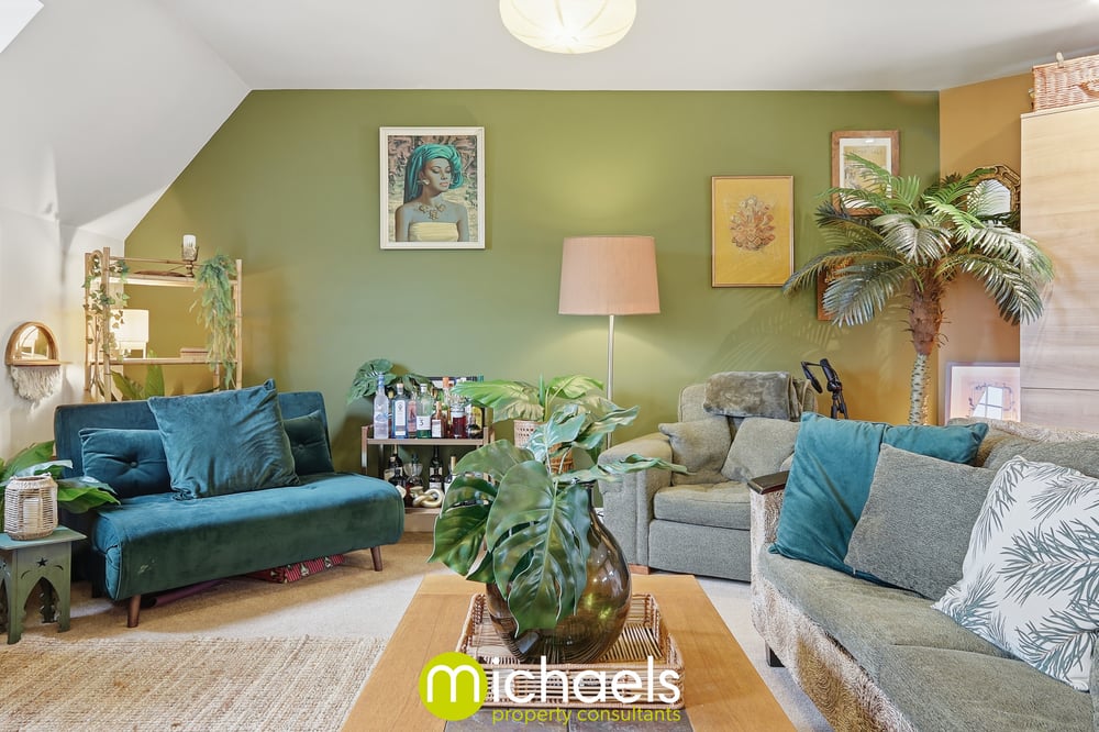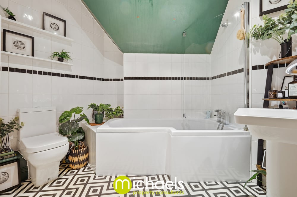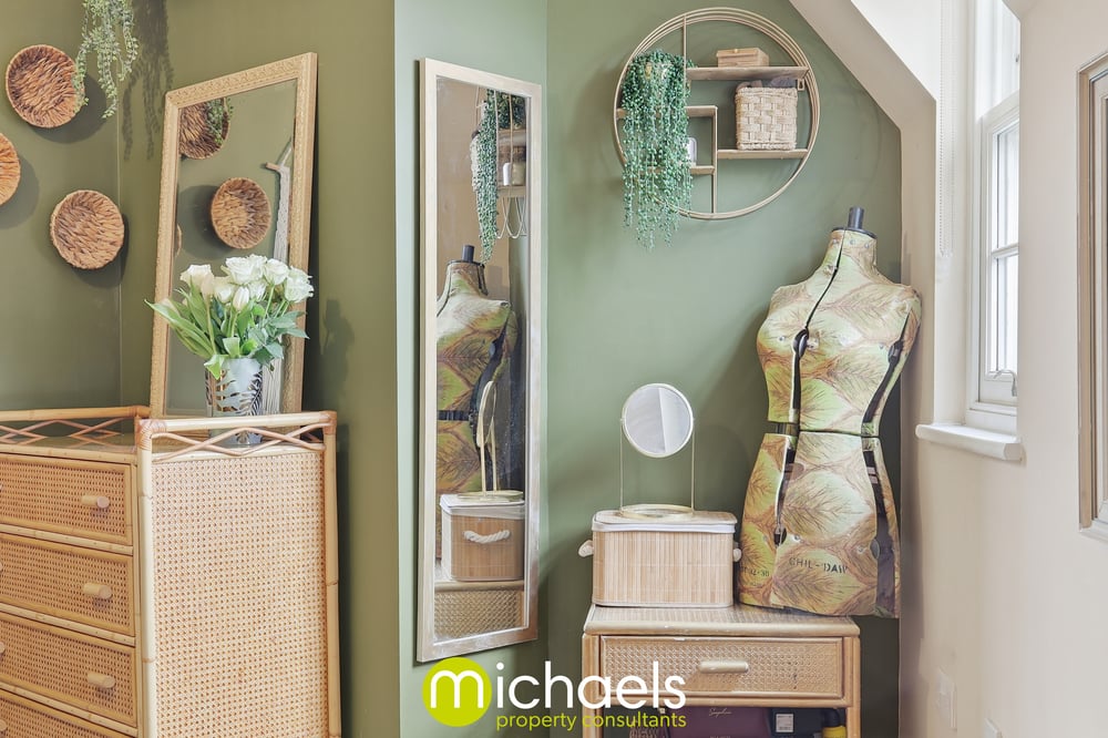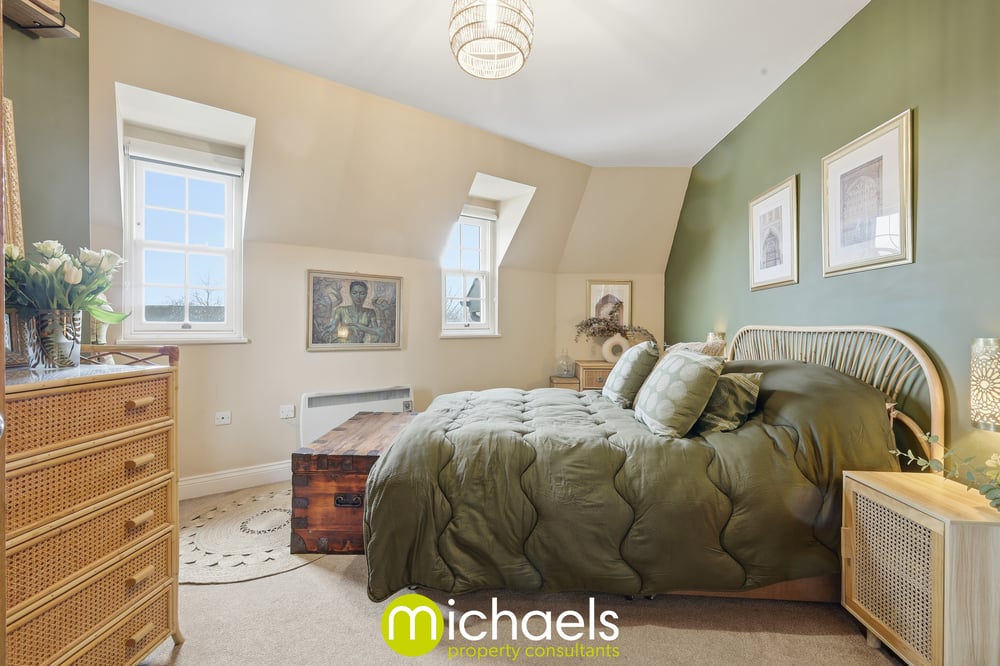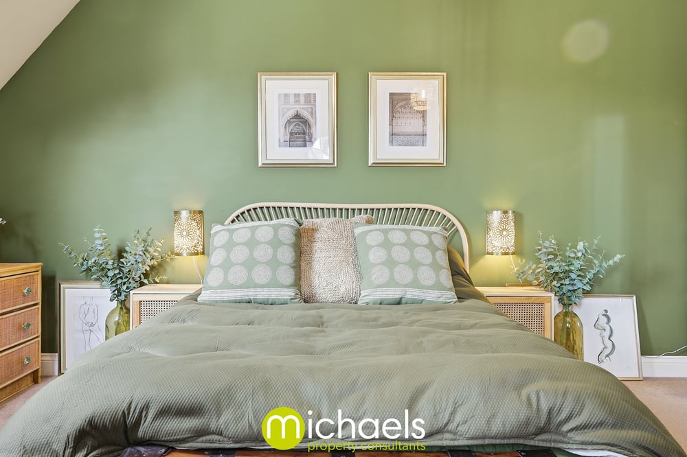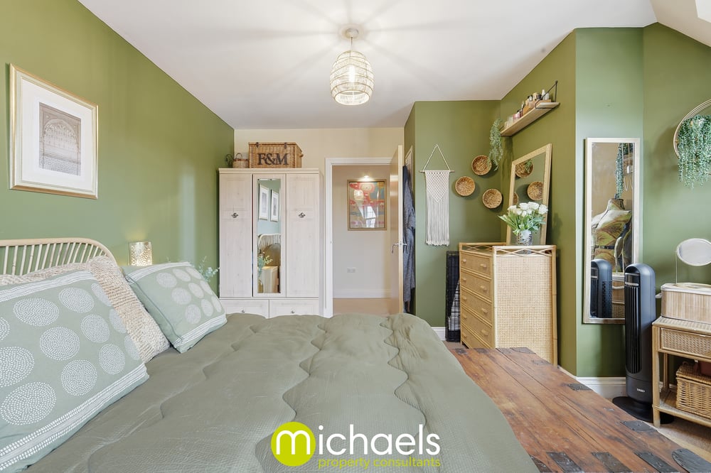 The spacious bedroom benefits from two large windows, allowing plenty of natural light to flow through. Soft, warm green tones enhance the sense of calm, creating a comfortable and relaxing atmosphere. A tiled bathroom suite services the property.