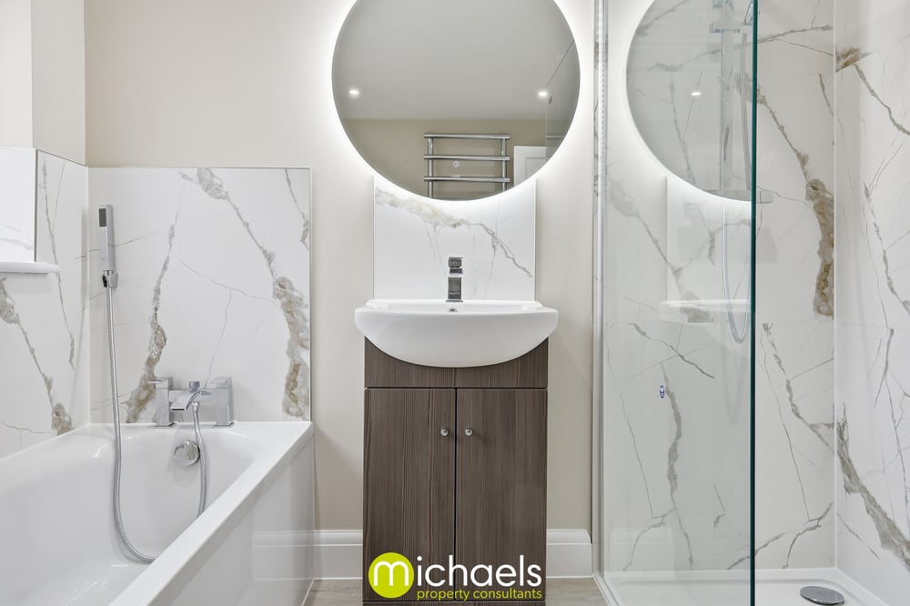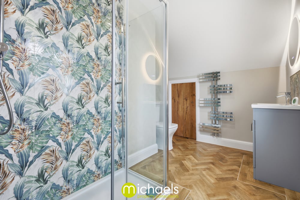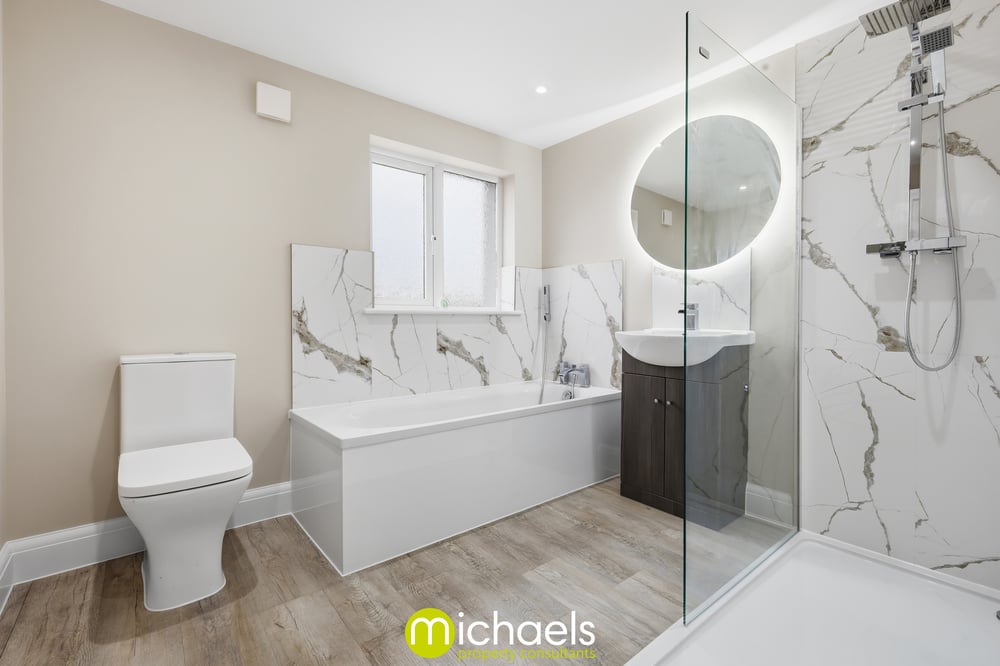 Upstairs, there are two generous double bedrooms and a third single bedroom, perfect for a growing family. A luxurious four-piece family bathroom serves the upper floor, while the principal bedroom enjoys a stunning en-suite shower room. Both bathrooms feature back-lit LED mirrors. Additional eaves storage is also available.