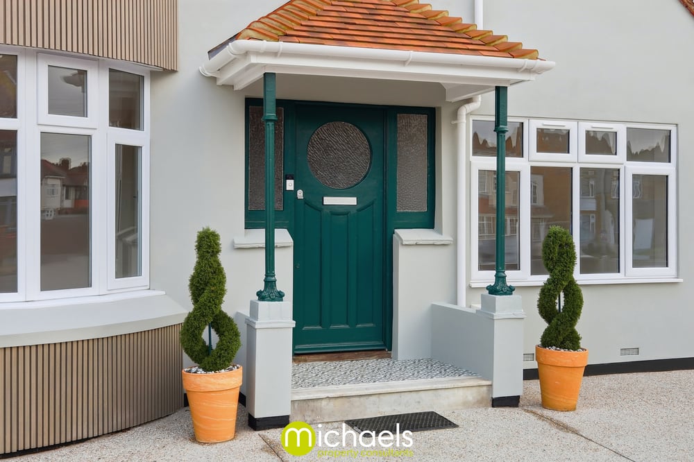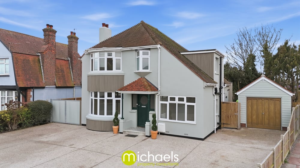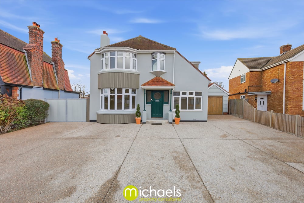 Approached via an attractive frontage with bay windows and a spacious driveway, the property offers secure off-road parking, a detached garage, side access suitable for boats or caravans, and a useful service door. A geometric tiled porch and traditional glazed entrance door set the tone for what lies within.