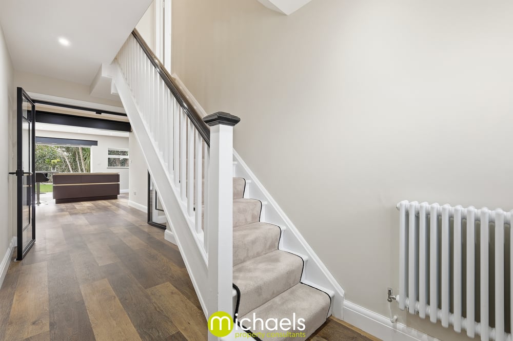 Inside, a welcoming entrance hall features planked LVT flooring and a striking high-gloss staircase. This leads to a formal front reception room with an elegant bay window.