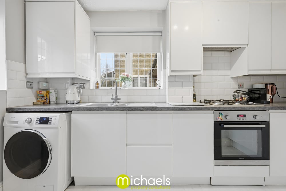 The accommodation begins with a spacious reception room featuring a box bay window and stairs leading to the first floor. To the rear is a modern high-gloss kitchen with tiled splashbacks, integrated oven and hob, space for appliances, and dual-aspect windows providing excellent natural light.