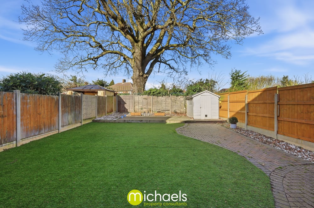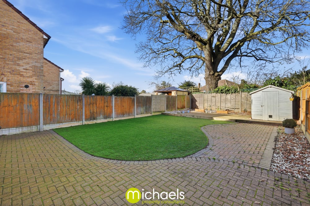 The landscaped, private, and enclosed rear garden includes a central lawn, block-paved area, raised decking, and shed. Boundaries are defined by panel fencing, with secure gated side access leading to the front driveway.