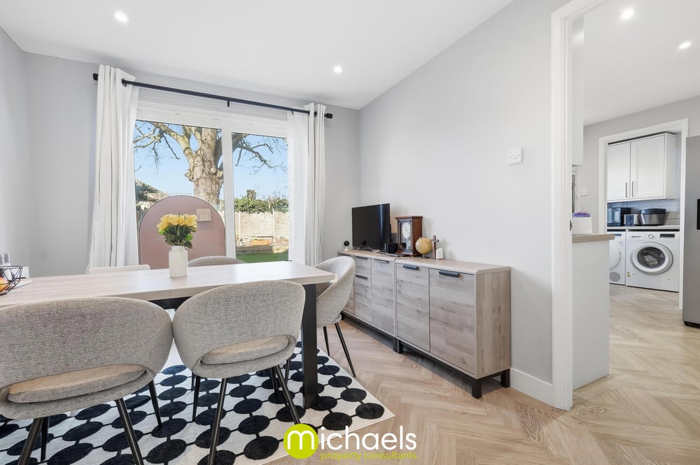 Approached via off-road parking and a garage, the property boasts an attractive gable-fronted façade. The entrance hall leads to an impressive reception room with herringbone flooring and glazed internal doors to a dining room with patio doors opening onto the rear garden. A tasteful shaker-style kitchen features tiled splashbacks and space for appliances, complemented by a utility room and ground floor WC. Internal access to the garage is also available.