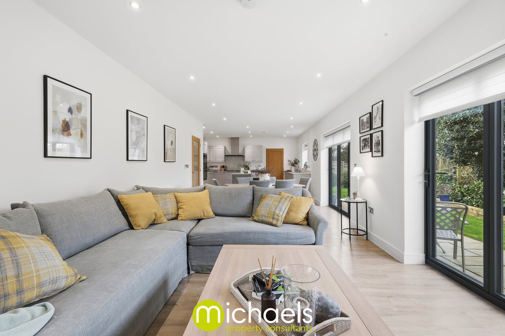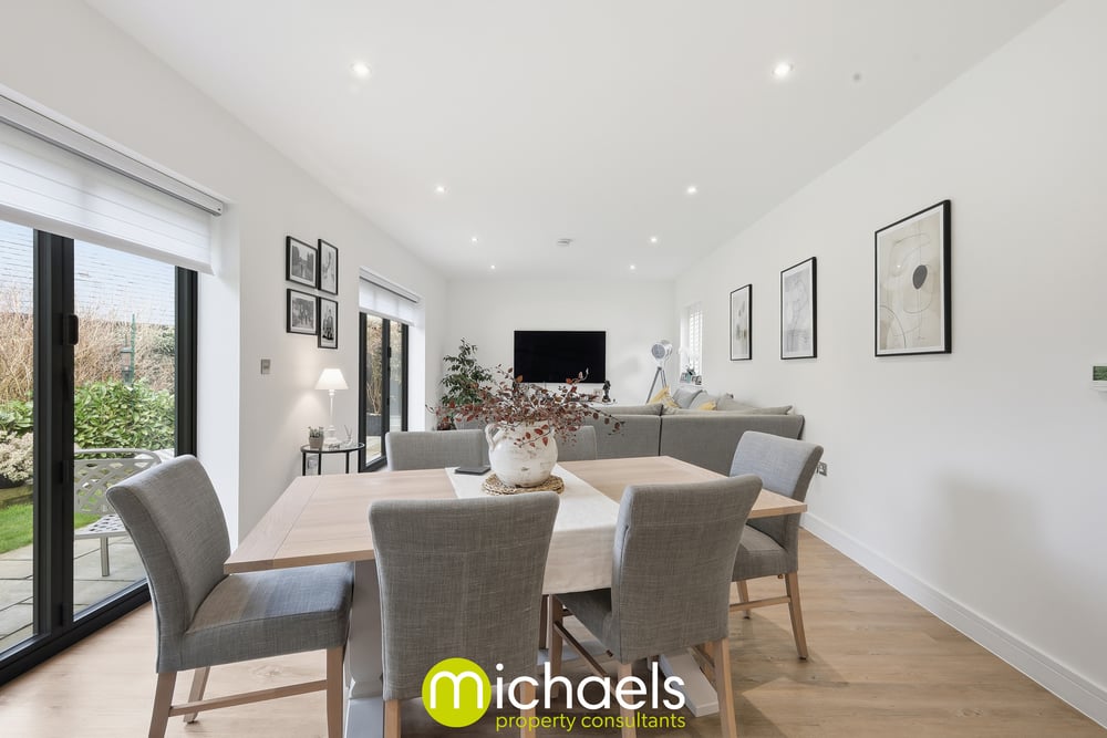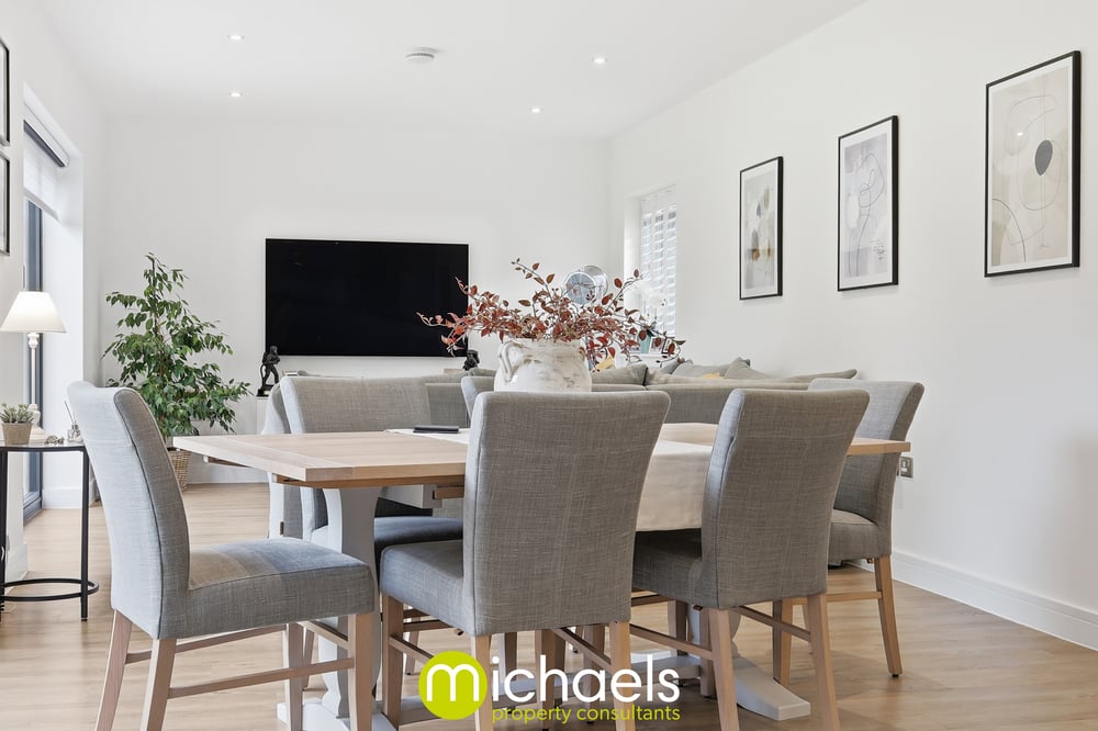 This versatile living space is finished with wood-effect flooring, recessed ceiling spotlights, and neutral décor, combining both style and practicality.