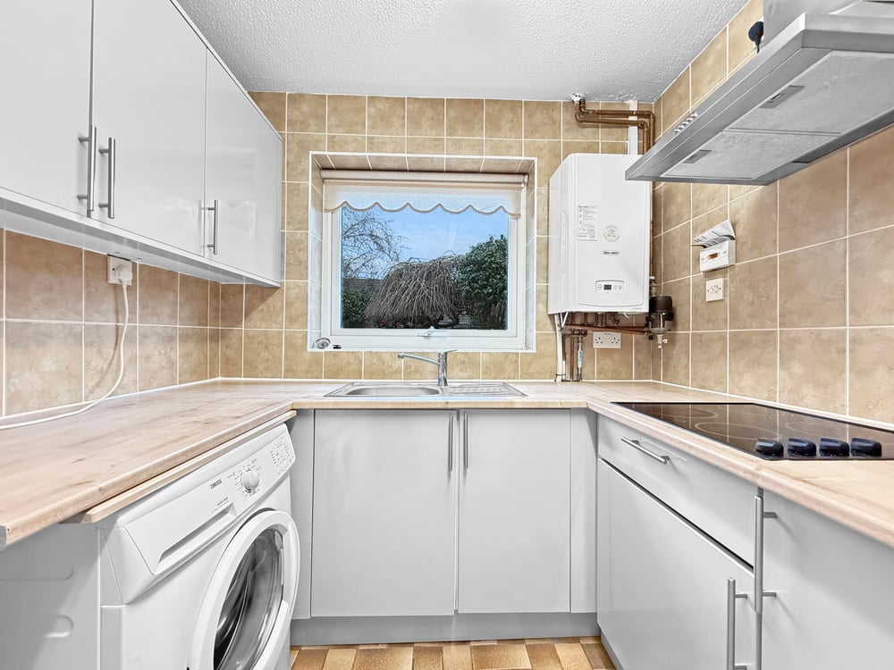 11' 6" x 7' 3" (3.51m x 2.21m) Window to rear, glazed door to side, tiled floor, fitted units and drawers with worktops over, inset sink and drainer, inset electric hob with extractor over, tiled splashbacks, matching eye level units, fitted oven, space and plumbing for appliances.