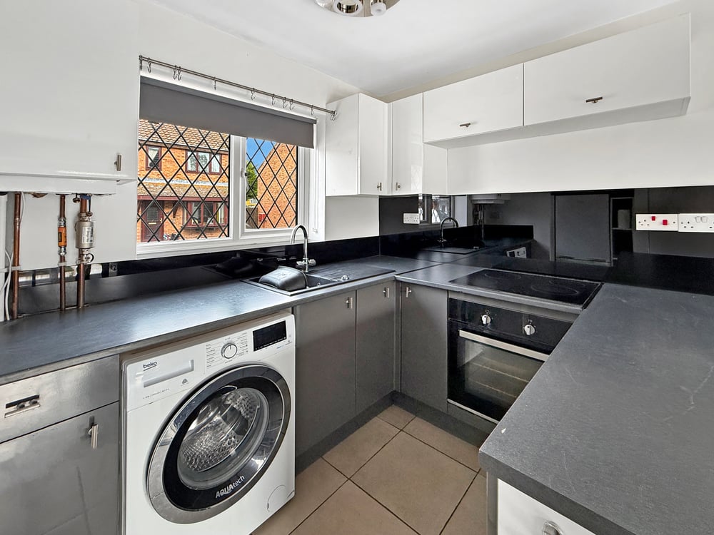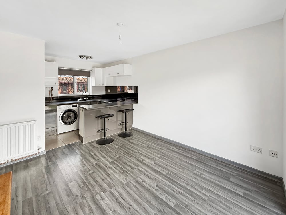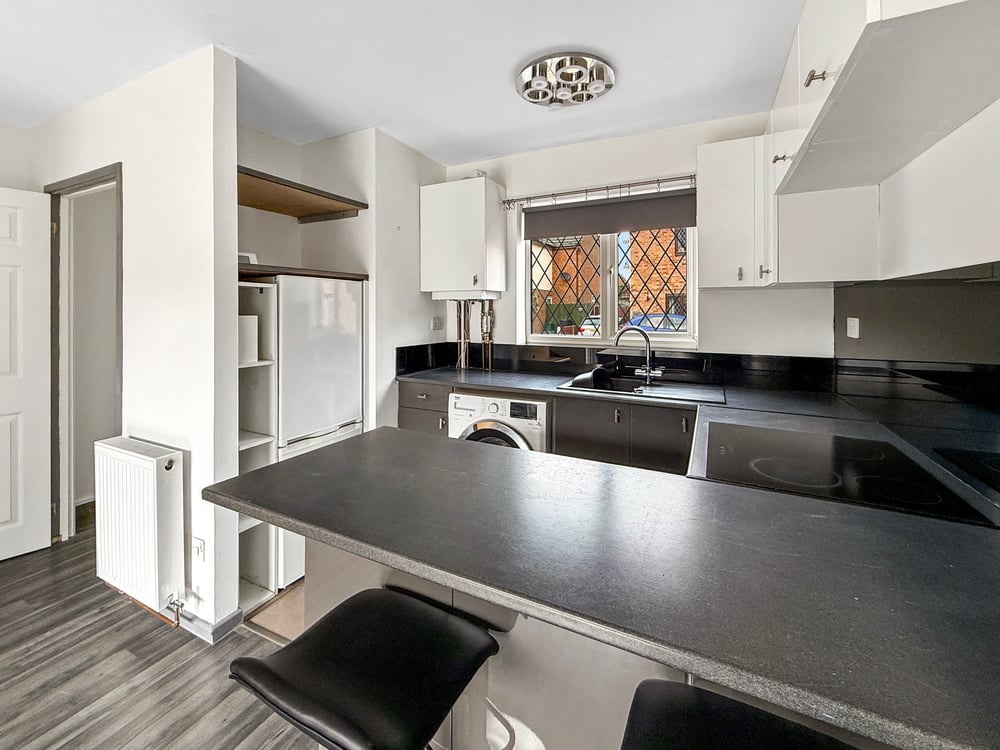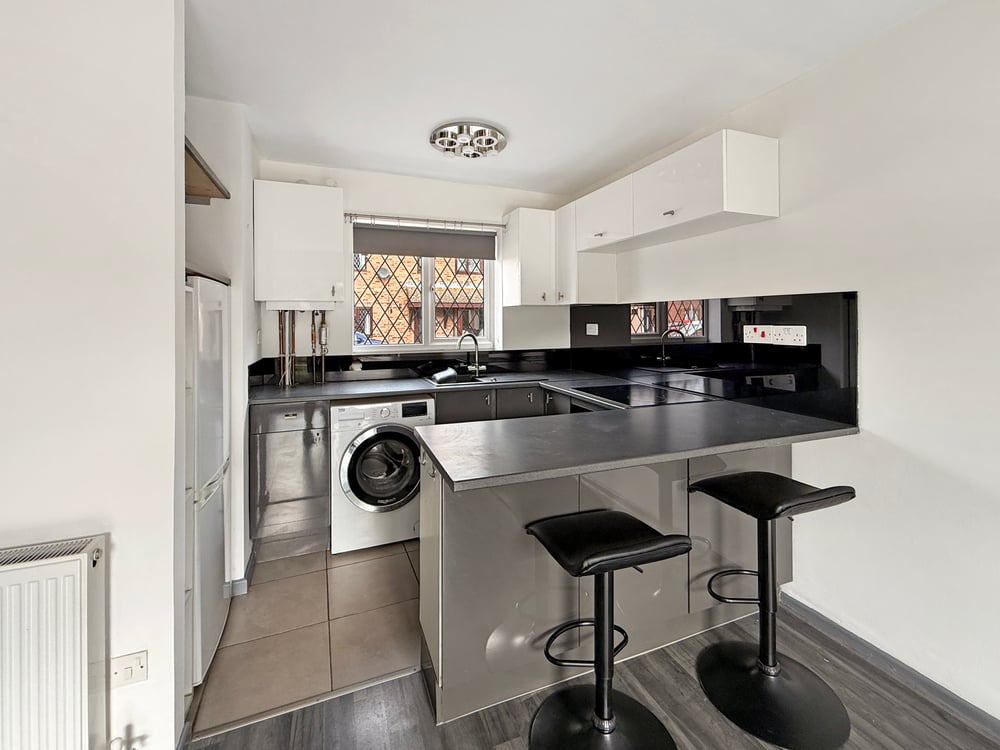 7' 0" x 7' 10" (2.13m x 2.39m) Double glazed window to front, fitted kitchen including a range of wall and base gloss units, breakfast bar, laminate worktop, tiled floor, integrated electric oven and hob, sink with right hand drainer, space for washing machine and fridge/freezer.