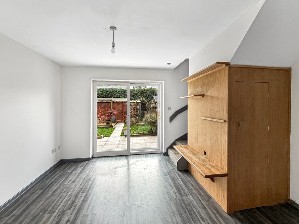 13' 11" x 11' 11" (4.24m x 3.63m) Double glazed patio door to rear, open plan living space, storage heater, stairs rising to first floor, under stairs storage.