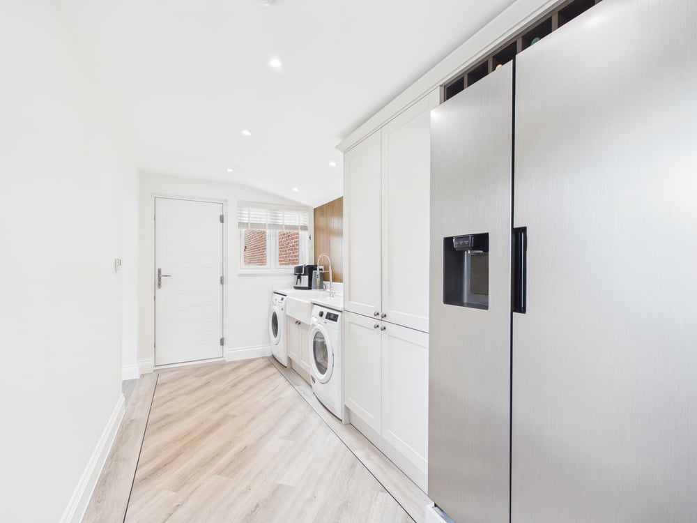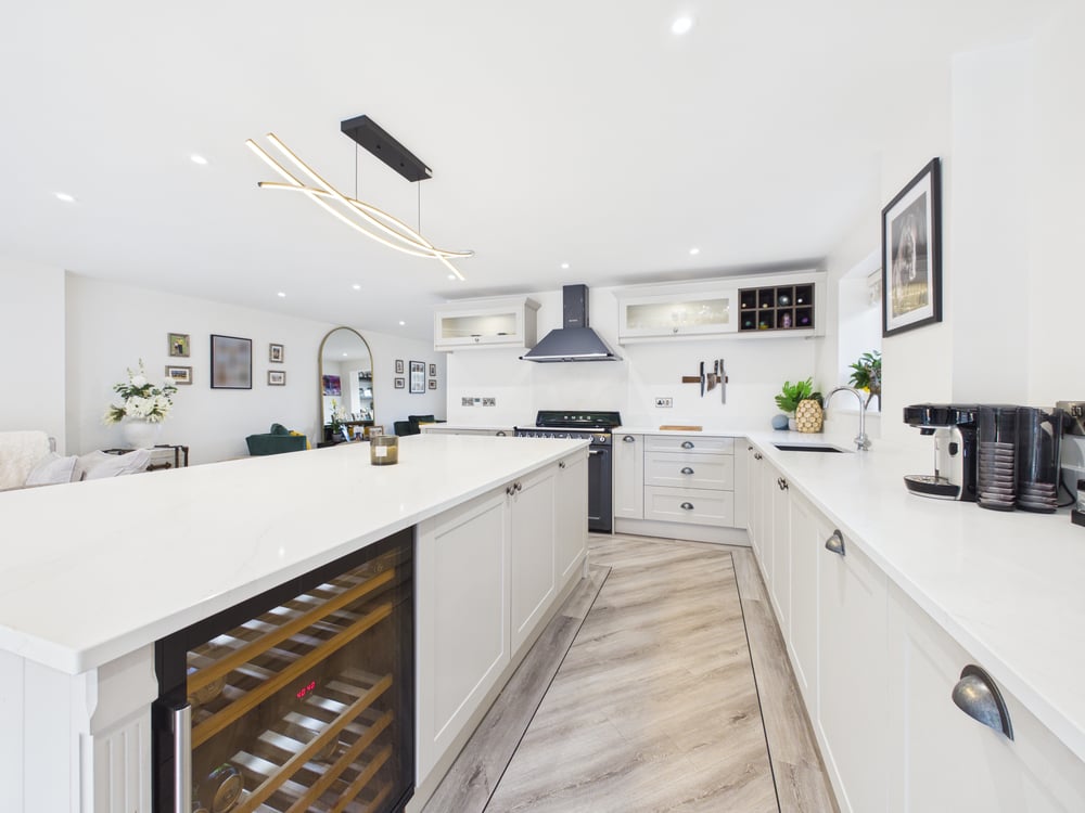 The heart of the home is undoubtedly the spectacular open plan kitchen, dining, and family room. Featuring sleek, high-quality fittings and a thoughtful layout, this space is perfect for both everyday life and entertaining guests. The bi-folding doors seamlessly connect the interior with the fully landscaped garden, flooding the space with natural light and providing excellent outdoor dining areas for al fresco gatherings. Adjacent to this is a cosy snug area, currently used as a dining space, offering a more intimate setting for meals or relaxation.
