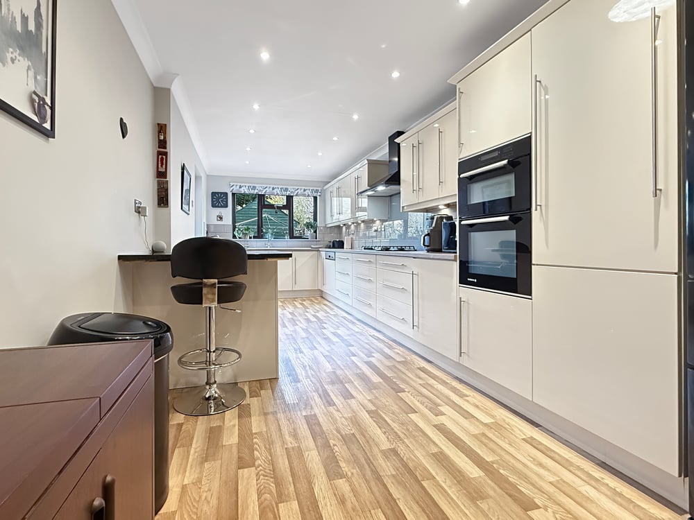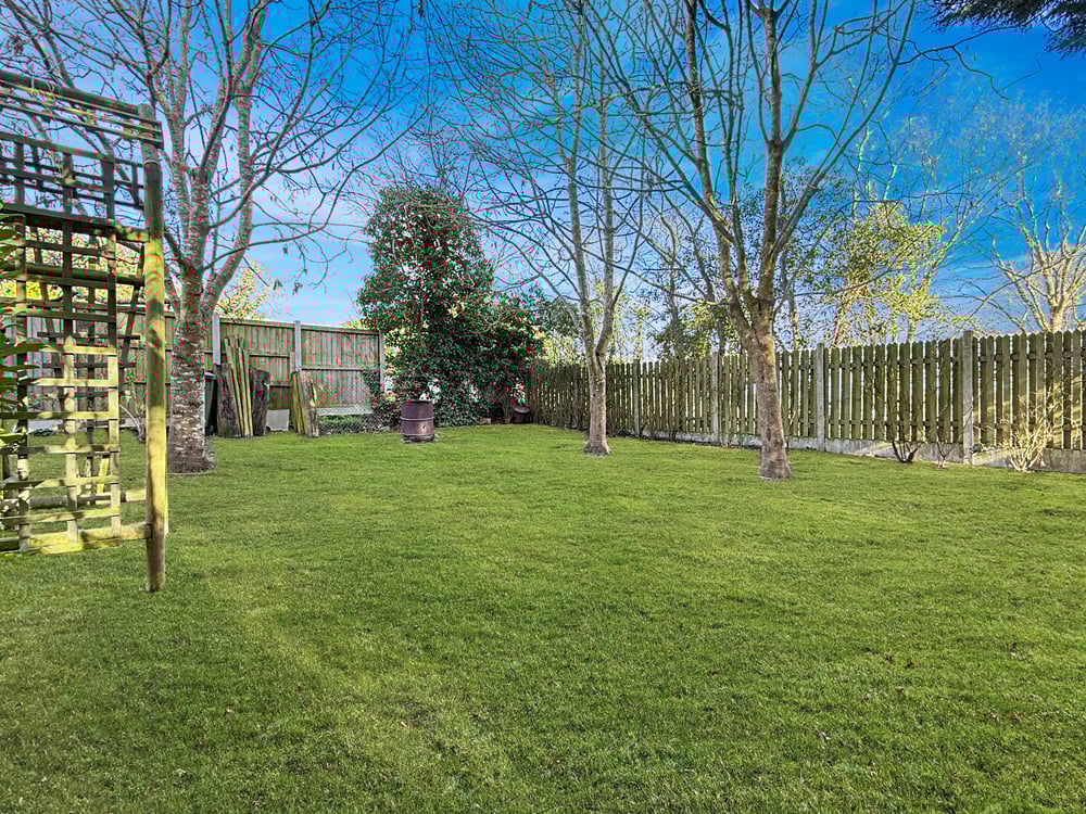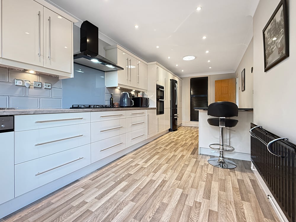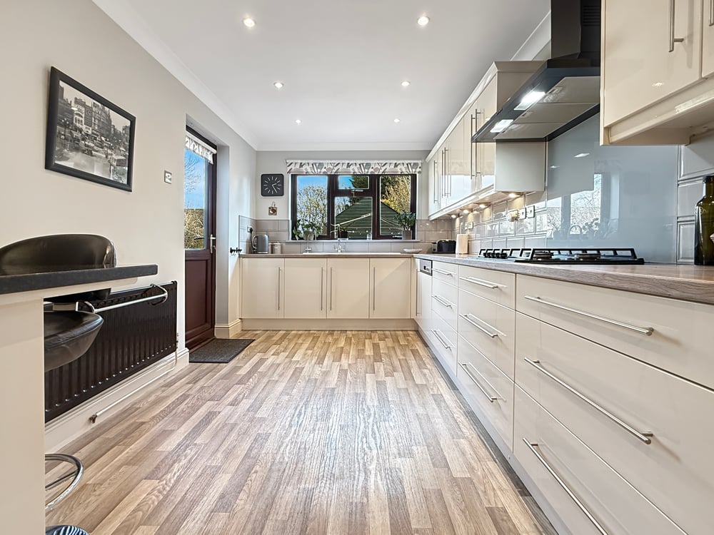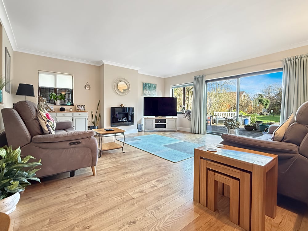 The accommodation begins with a welcoming entrance hall, bright and airy living room, complete with patio doors opening directly onto the rear garden — perfect for enjoying the picturesque outlook and entertaining in the warmer months. The modern kitchen is fitted with a range of contemporary units and integrated appliances, complemented by a useful pantry and direct access to the garden. A separate dining room provides an ideal space for family meals or hosting guests.