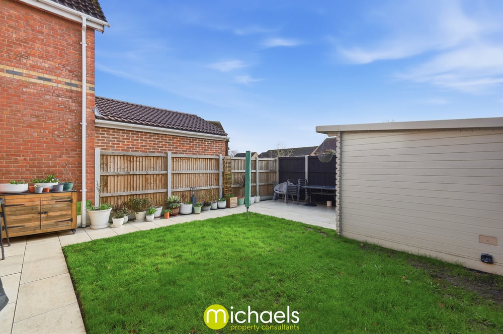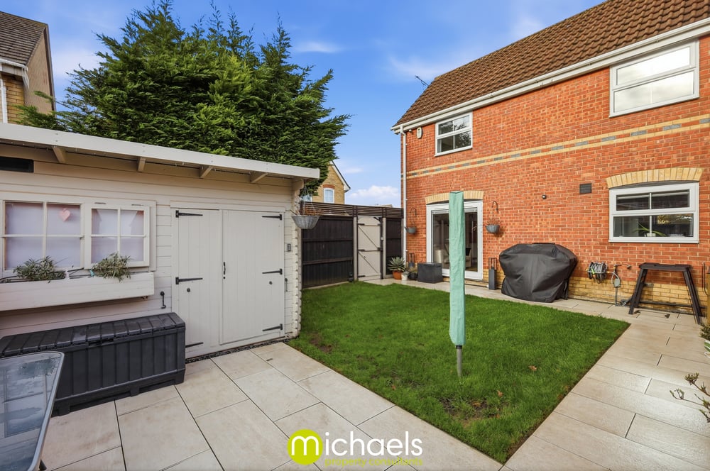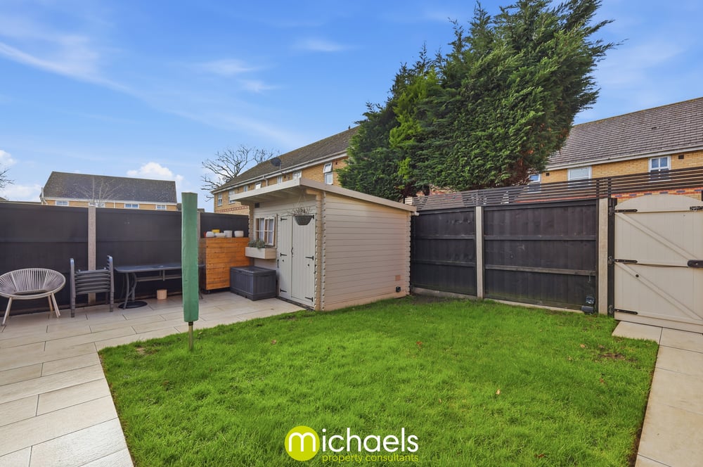 Externally, the rear garden enjoys a central lawn area, patio seating space, surrounding pathway, secure side access, and an outhouse. To the front, there is parking along with the added benefit of a double shared carport (the left-hand side belonging to this property).