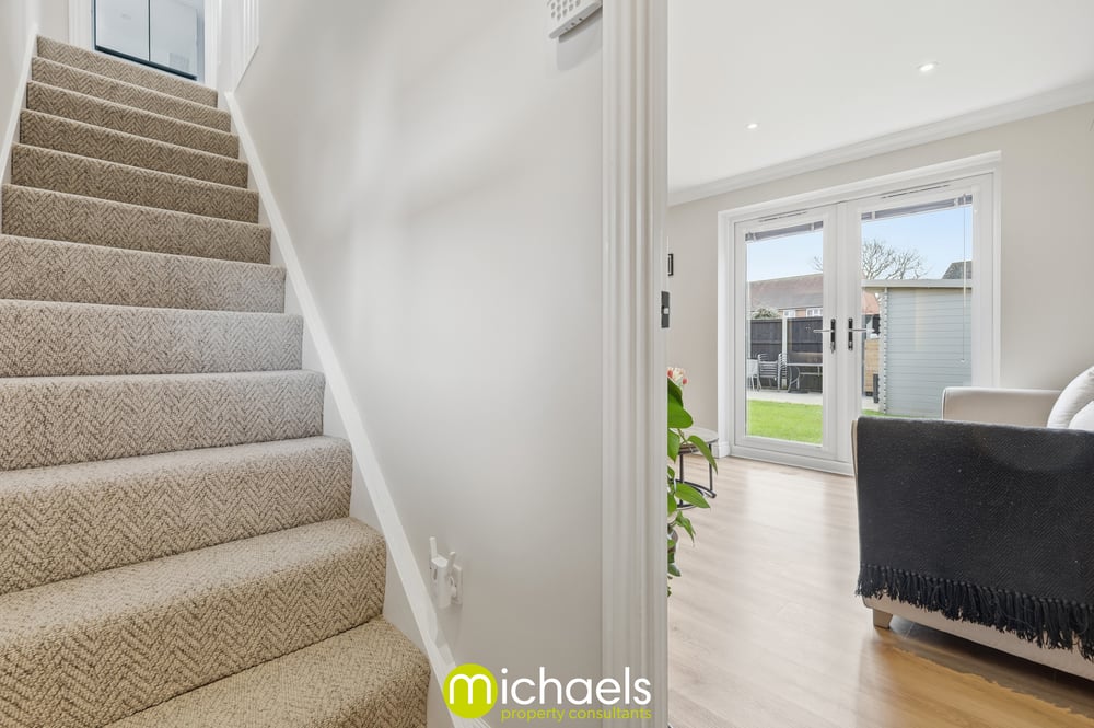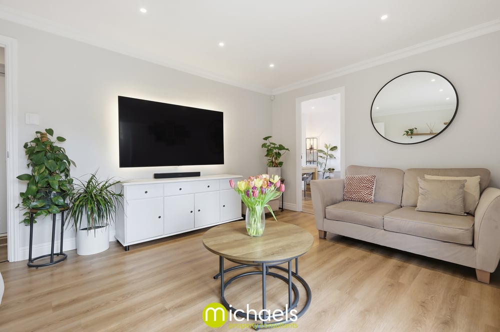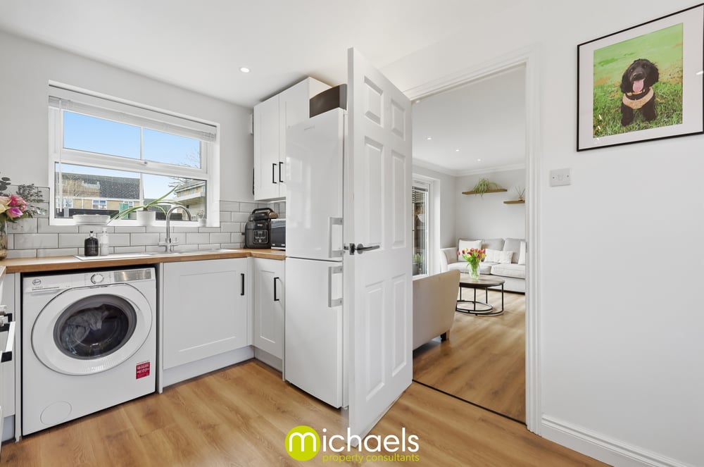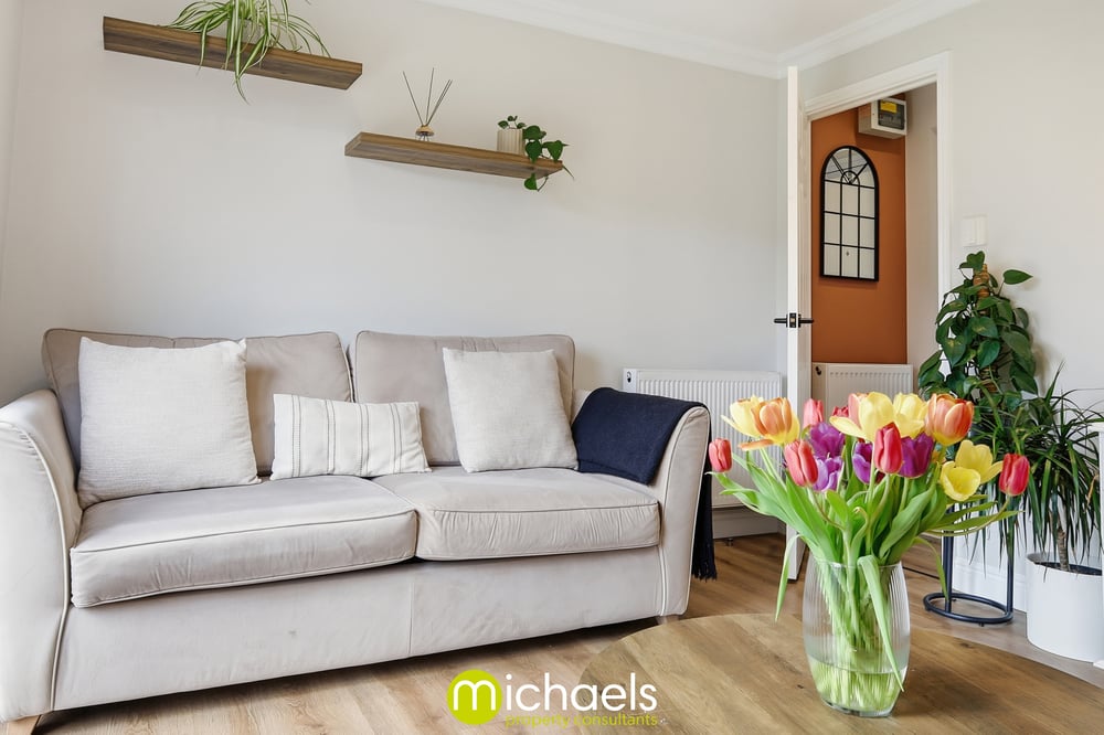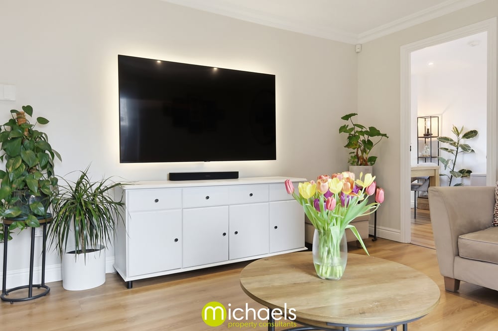 Tucked away in a quiet position, the home welcomes you with an inviting entrance hall and stairs leading to the first floor. The bright and spacious living room features wood-effect LVT flooring, recessed spotlighting, and patio doors opening onto the rear garden, allowing an abundance of natural light to flood the space.