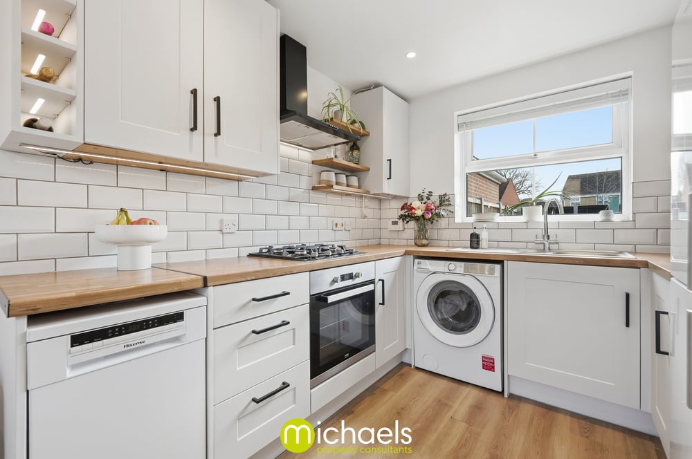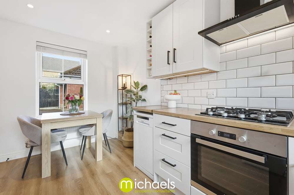 The modern shaker-style kitchen/diner is fitted with a tiled splashback, inset oven and gas hob, and offers space for appliances, creating a practical yet stylish entertaining area.