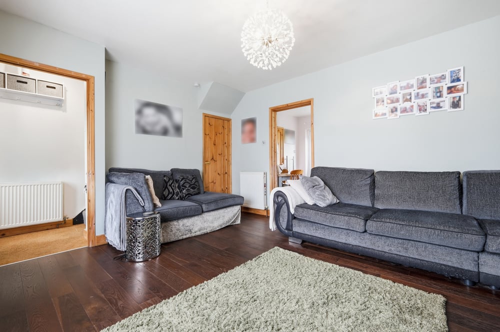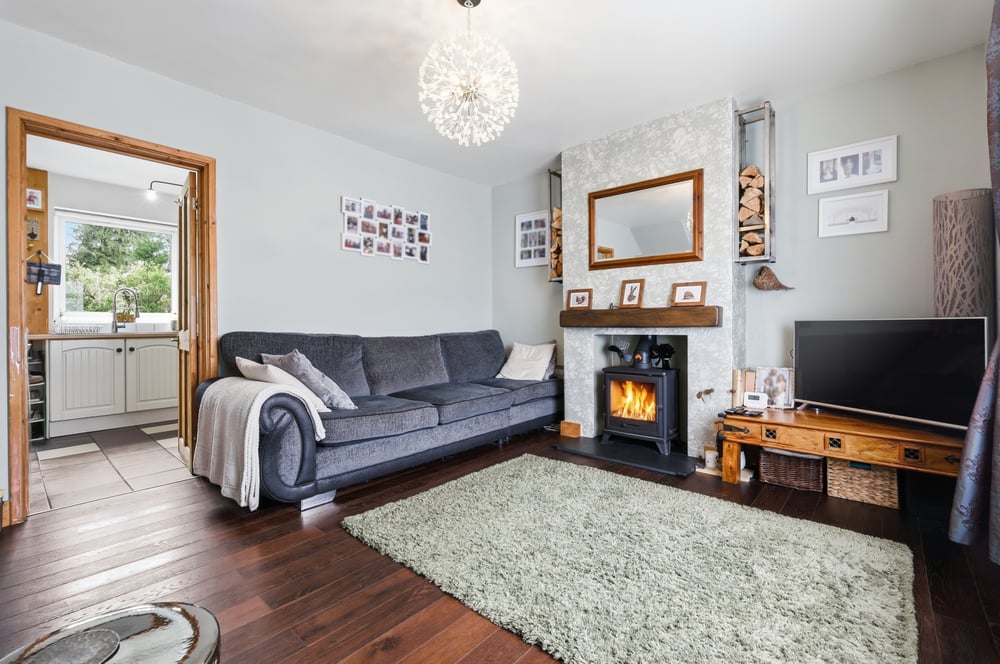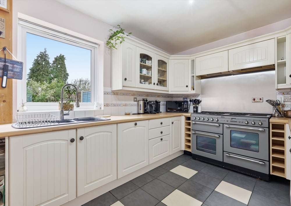 Upon entering, you are welcomed into a spacious front-aspect living room that perfectly captures the scenic views across the front garden and the distant fields beyond. The room features a recently installed log burner, creating a warm and inviting atmosphere, ideal for relaxing evenings or entertaining guests. Large windows flood the space with natural light, highlighting the room’s generous proportions and elegant layout.