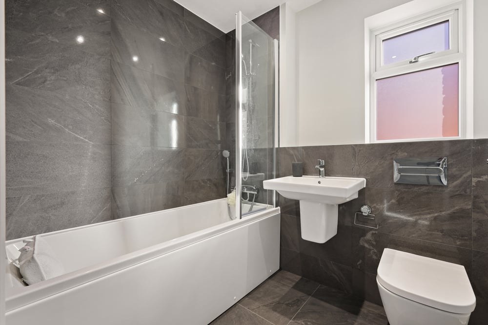 Obscure window to side, tiled floor and walls, panel bath, wall hung wash hand basin, WC.