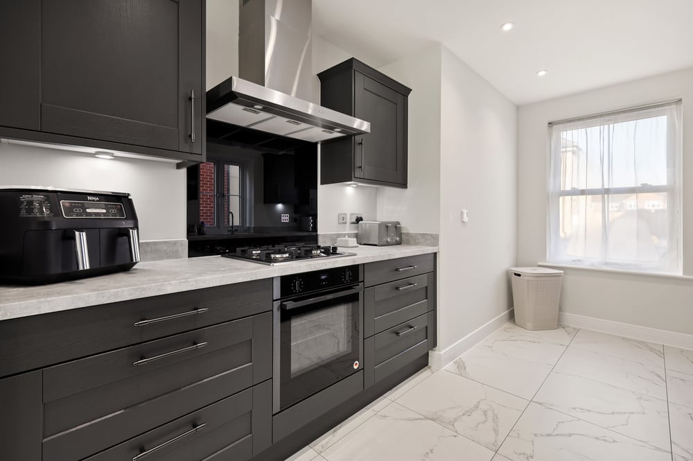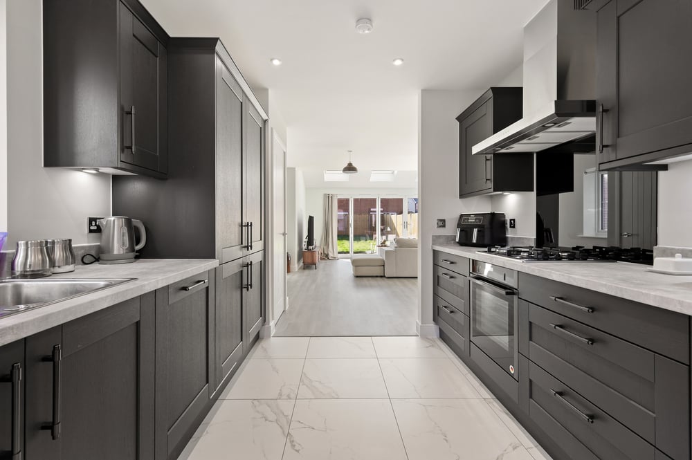 13' 9" x 9' 2" (4.19m x 2.79m) Sash window to front, tiled floor with heating under, a contemporary range of fitted units with square edge worktops over, inset gas hob, fitted oven, inset sink, extractor, integrated appliances, matching eye level units.