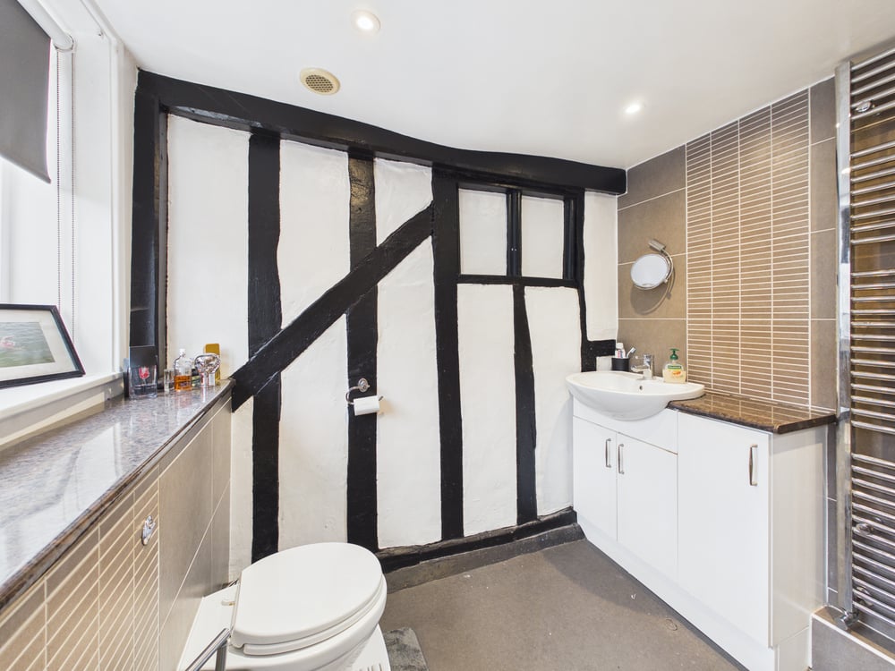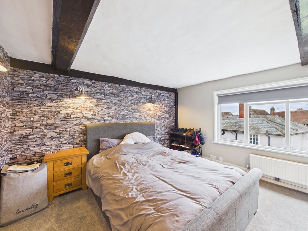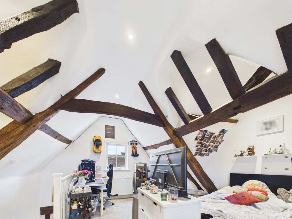 Upstairs, on the second floor, the main bedroom impresses with its vaulted ceiling and exposed beams, giving it a spacious yet cosy feel. This room effortlessly blends character with comfort, offering a tranquil space to unwind. There is a further double bedroom, equally well proportioned and perfect for family, guests, or a home office. The modern shower room has been thoughtfully designed with sleek fixtures and a fresh, clean finish.