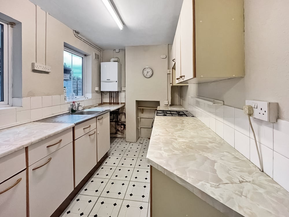 Offered to the market with no onward chain, the property opens into a welcoming living room featuring a fireplace, which leads through to a separate dining room/reception area with direct access to the rear garden. Completing the ground floor is a well-equipped kitchen with space for appliances. To the first floor are two generous bedrooms and a family bathroom, accessed via the second bedroom. Externally, the property benefits from a low-maintenance courtyard-style rear garden with outside storage sheds. To the front, the property offers permit parking.