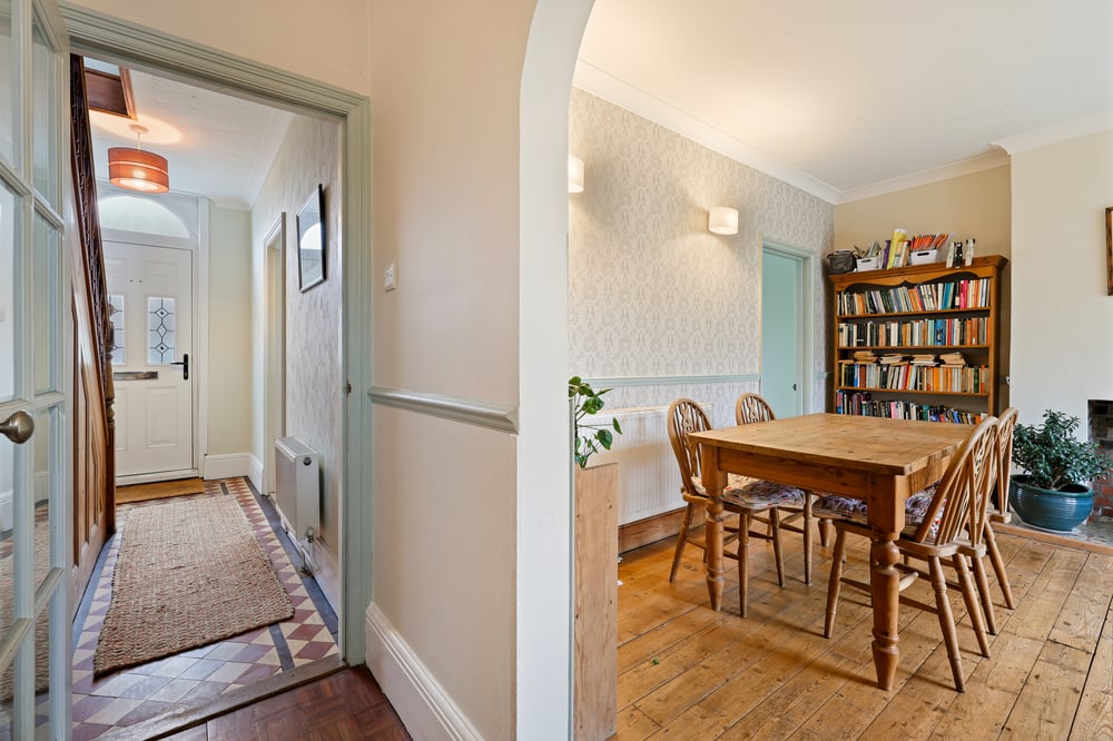 The accommodation begins with a welcoming entrance hall featuring original tiled flooring and stairs rising to the first floor. To the front of the property is a warm and inviting reception room with an attractive bay window, while the spacious dining room to the rear benefits from large patio doors that flood the room with natural light and provide access to the garden.