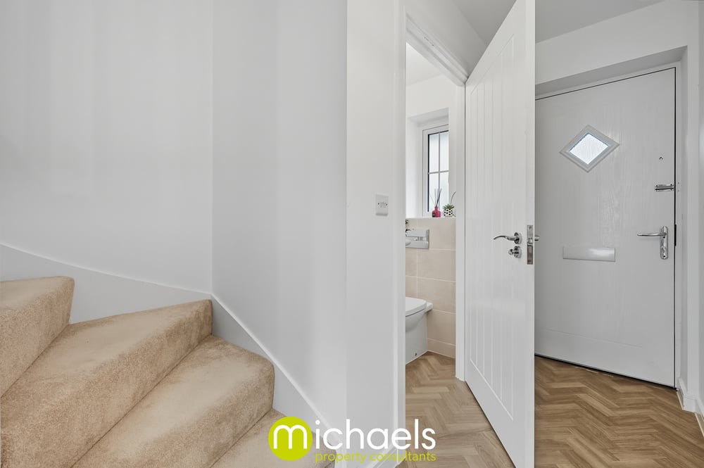 The ground floor comprises a welcoming entrance hall and a convenient cloakroom. The well-equipped kitchen offers space for appliances, which the vendors intend to leave for the benefit of the new owners. A bright and spacious living room provides an ideal space for relaxation, with patio doors opening onto a generous, private, and enclosed rear garden. Herringbone LVT flooring enhances the ground floor living space.