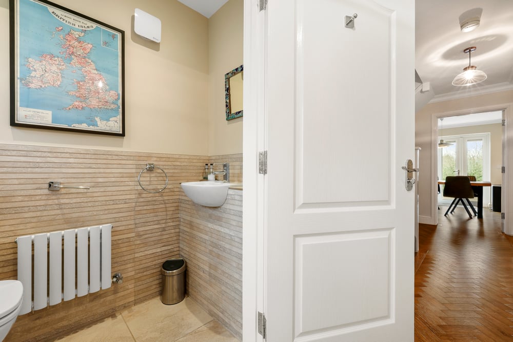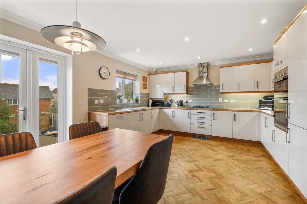 The well-presented accommodation comprises a welcoming entrance hall, leading to a ground floor cloakroom, a generous kitchen/dining room complete with French doors opening onto the rear garden ideal for entertaining and everyday living. Upstairs, the property boasts a spacious living room, four well-proportioned double bedrooms, including a principal bedroom with a stylishly refitted en-suite shower room, alongside a contemporary family bathroom finished to a high standard.