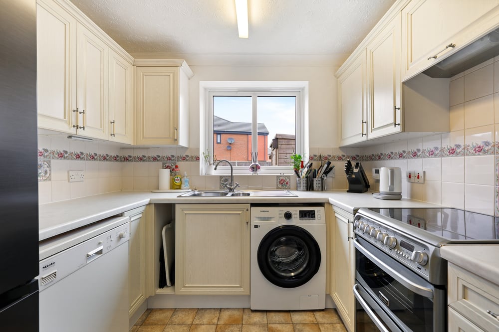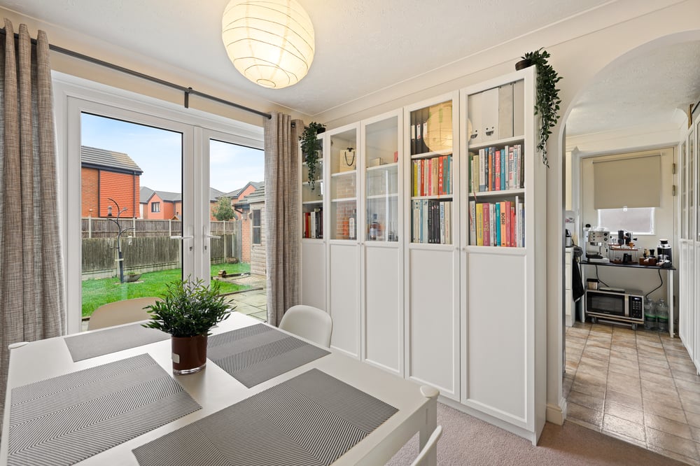 To the rear of the property is the dining room and kitchen. The dining room benefits from patio doors opening to the rear garden, allowing a wealth of natural light to flow through the space. The adjoining kitchen provides ample storage and work surfaces, along with space for appliances.