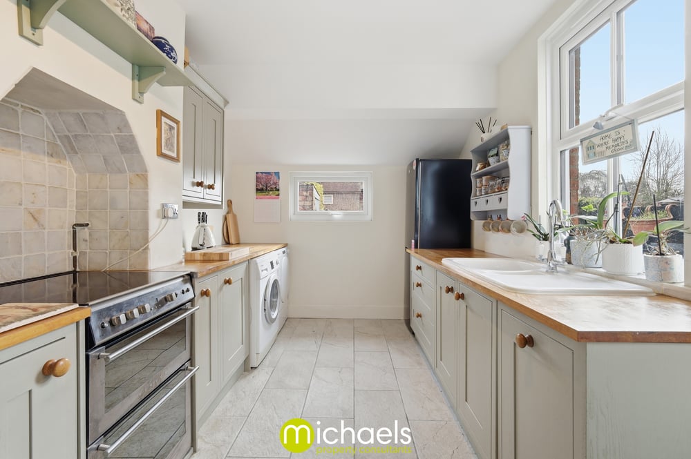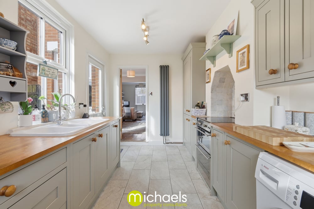 To the rear, an upgraded Shaker-style kitchen offers a ceramic sink, integrated dishwasher, space for appliances and access to the garden.