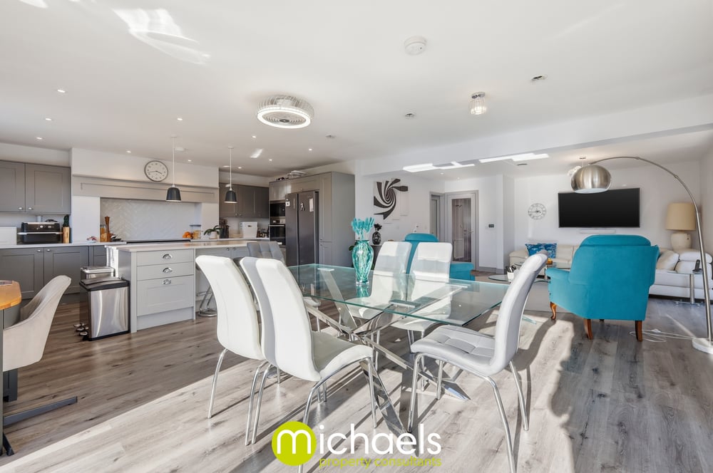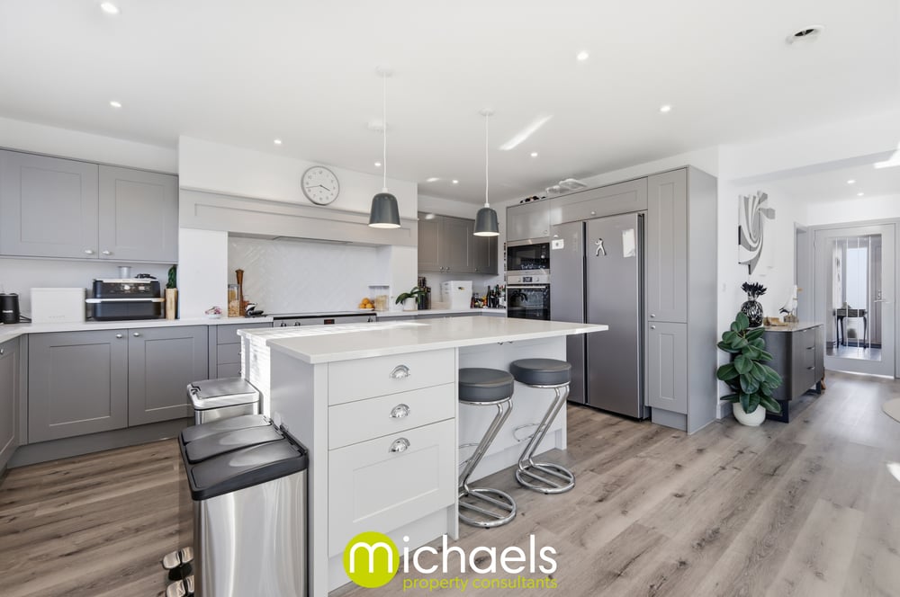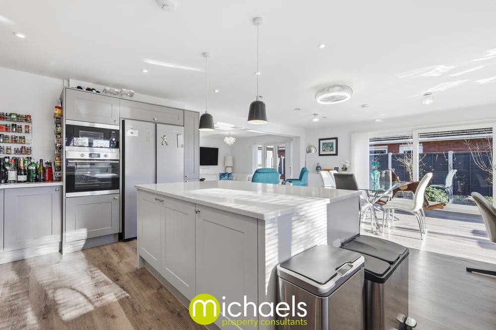 The living accommodation has been thoughtfully enhanced by the current owner, who has opened up the space between the living and dining areas to create a seamless, open-plan environment. This impressive area benefits from floor-to-ceiling windows and French doors, providing an abundance of natural light and direct access to the side and rear garden perfect for both everyday living and entertaining. The focal point of this exceptional home is the substantial rear addition, measuring approximately 26ft x 17ft, offering a versatile open-plan kitchen, dining and living space. The high specification kitchen features a range of grey tone units with chrome fittings, a selection of integrated Hotpoint appliances, a range cooker with inset extractor hood, traditional herringbone tiled splashback and an inset ceramic sink. A central island with marble work surfaces provides ample storage and preparation space, complemented by downlighters and LED spotlights throughout. Two sets of retractable patio doors further enhance the space, creating a bright and sociable hub of the home.