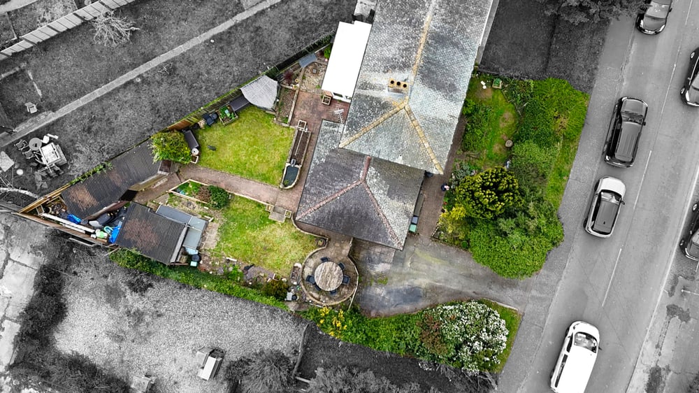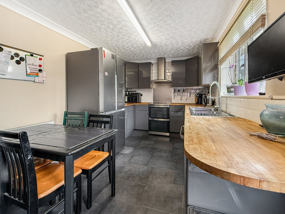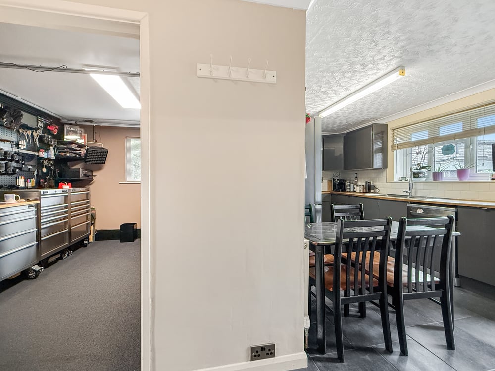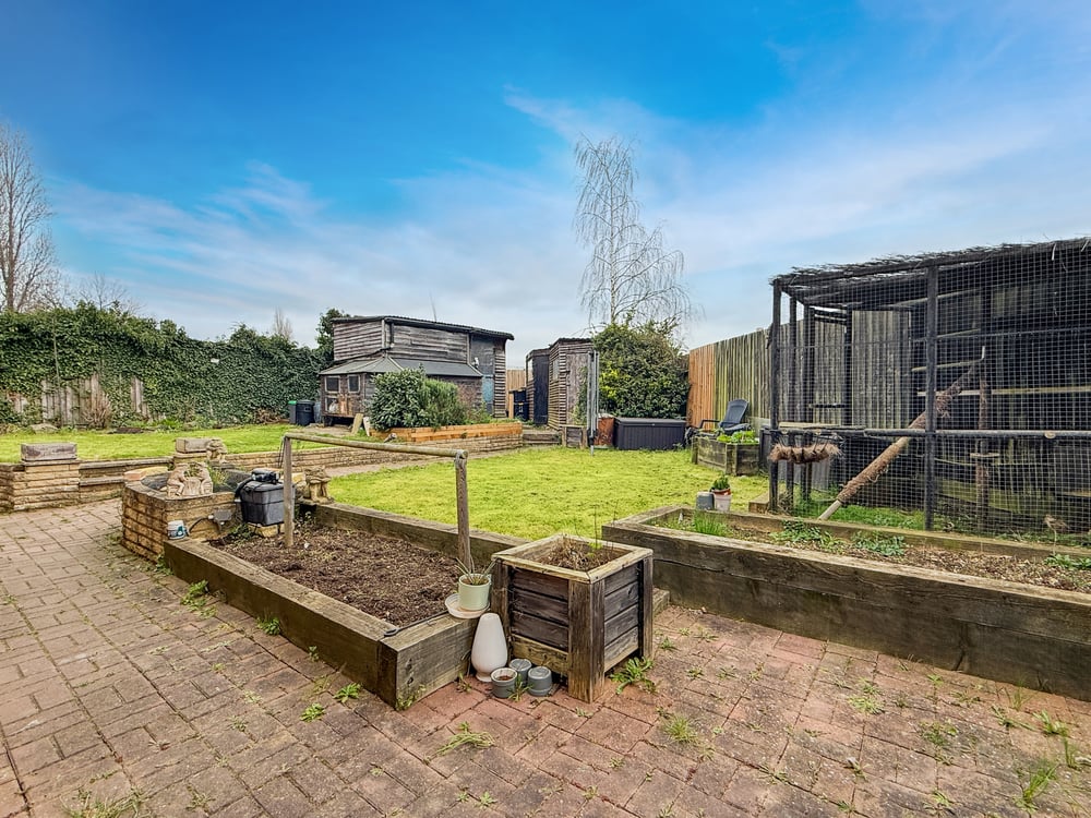 Upstairs, the property features three well-sized bedrooms and a family bathroom. Externally, the home enjoys a substantial corner plot with clear scope for further extension or alteration (subject to planning permission). The generous rear garden includes multiple timber outbuildings and a selection of patio areas, ideal for outdoor entertaining. To the front, a private driveway provides off-road parking for multiple vehicles.
