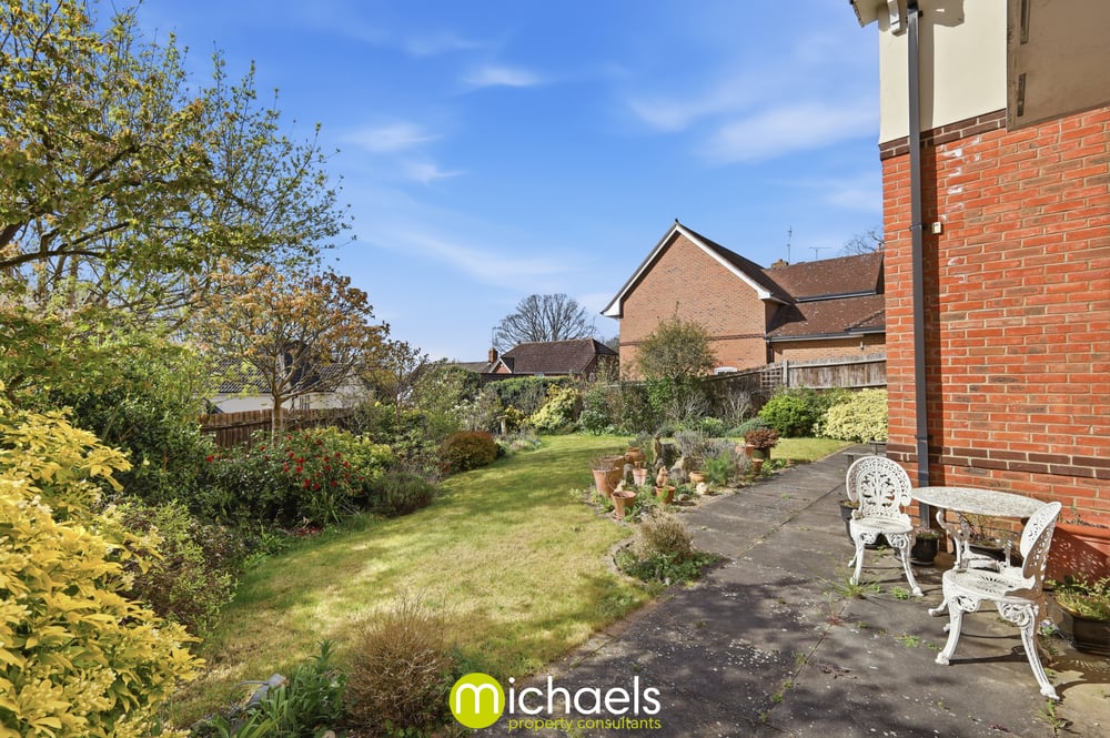 A patio area provides an ideal setting for outdoor dining and entertaining, while the overall garden offers plenty of space for families and those who enjoy gardening.