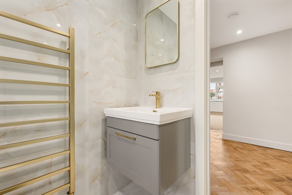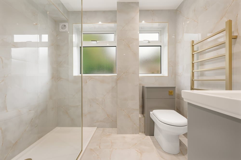 Two obscure windows to side, walk in shower with rainfall shower head, vanity wash hand basin, vanity WC, heated towel rail, tiled floor and walls.