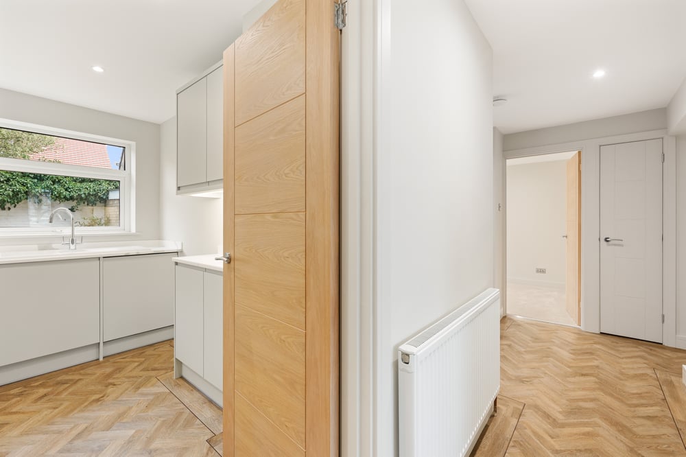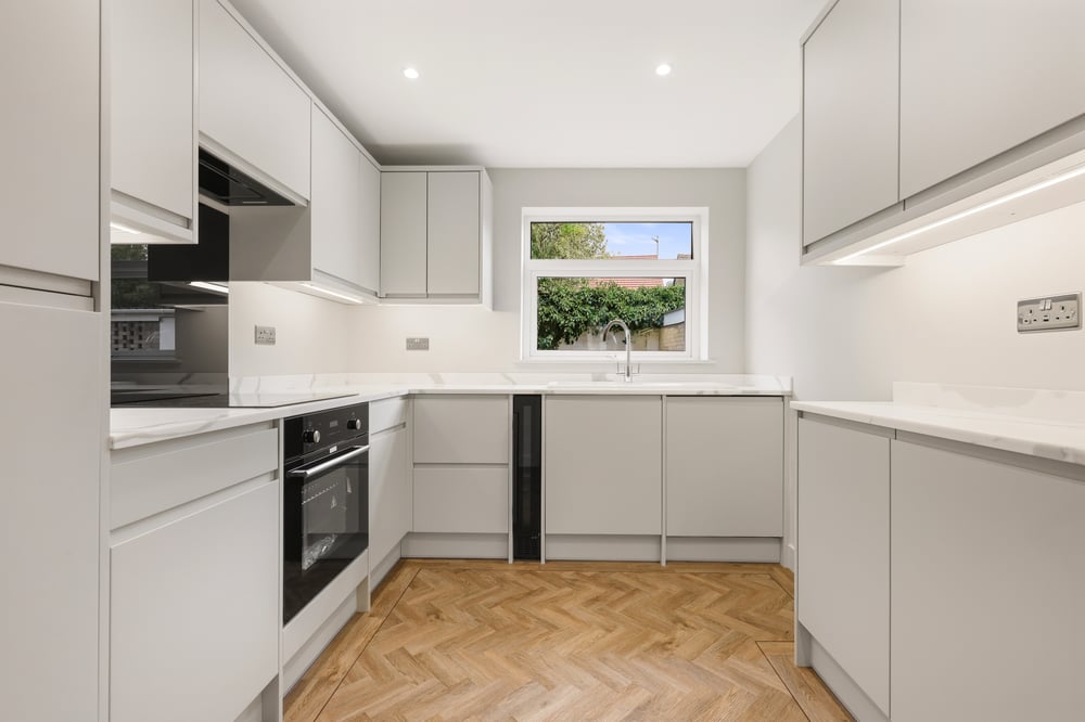 10' 6" x 8' 6" (3.20m x 2.59m) Herringbone laid LVT floor, window to side, a contemporary range of fitted units and drawers with stone worktops and upstands, inset sink, fitted oven, inset hob with extractor over, matching eye level units, integrated dishwasher, integrated fridge/freezer, wine cooler.