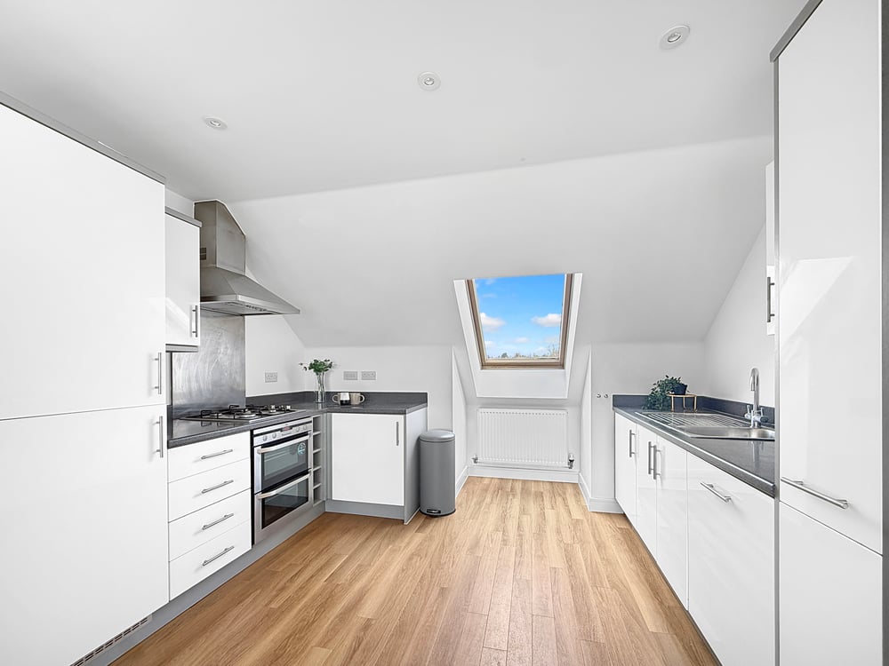 19' 0" x 10' 4" (5.79m x 3.15m) Velux window to the front and rear, radiator, inset spot lights, a modern fitted kitchen including integrated sink, gas hob, over head fan, fridge/freezer, dish washer, washing machine. The kitchen opens onto the open plan lounge/diner with views over the Estuary.