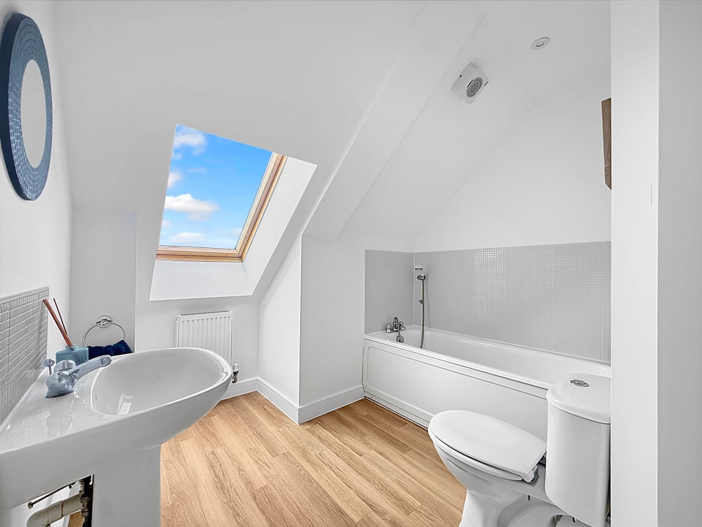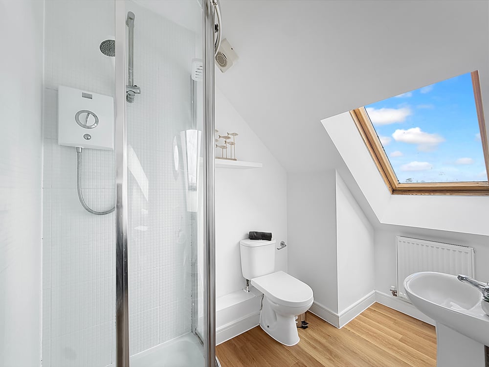 Velux window with stunning views, Part tiled walls, radiator, panned bath with over head shower, WC and wash hand basin.