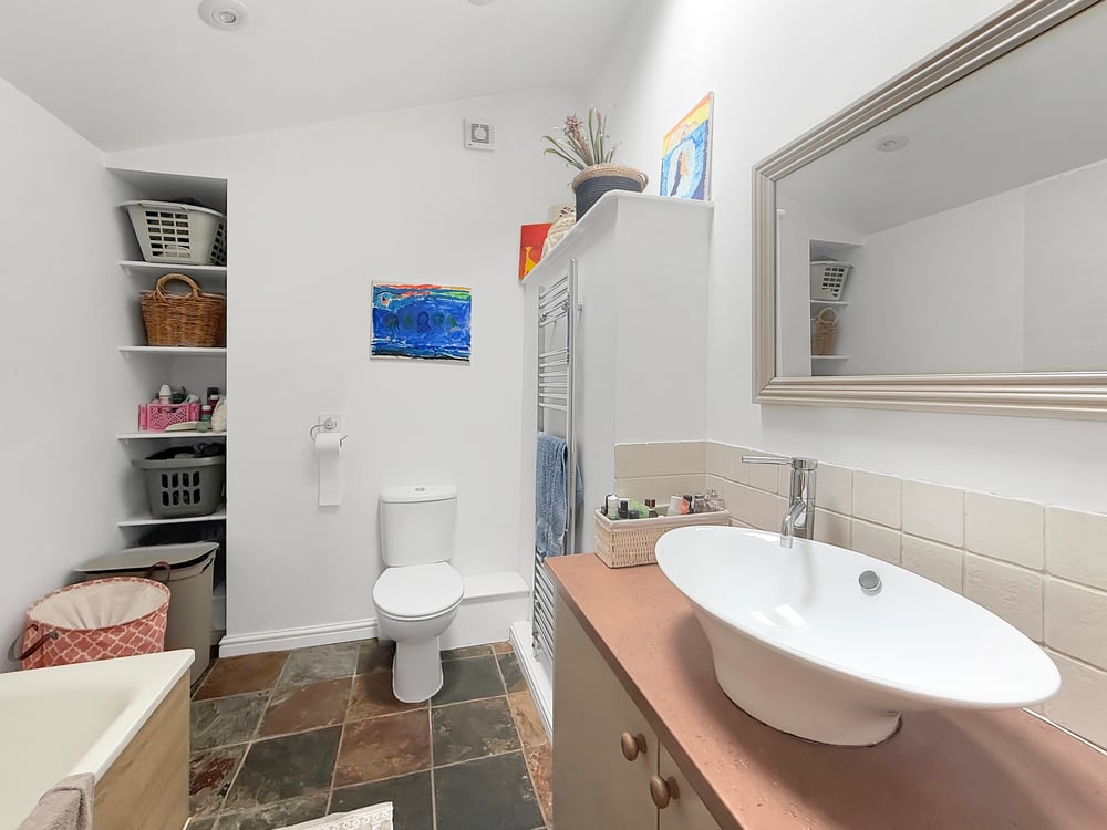 Inset spot lights, part tiled walls and tiled flooring, paneled bath with wall mounted shower low level WC, vanity wash hand basin, heated ladder towel rail