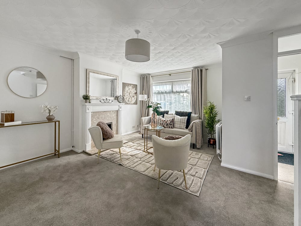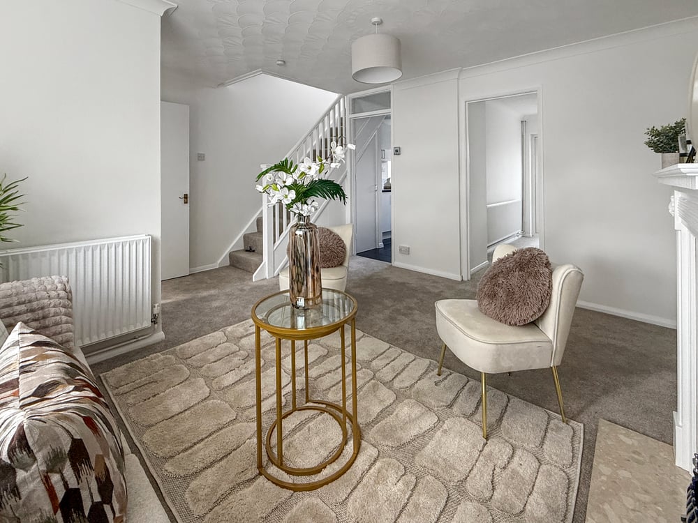 Double glazed window to front, fireplace, two radiators, straits to first floor.