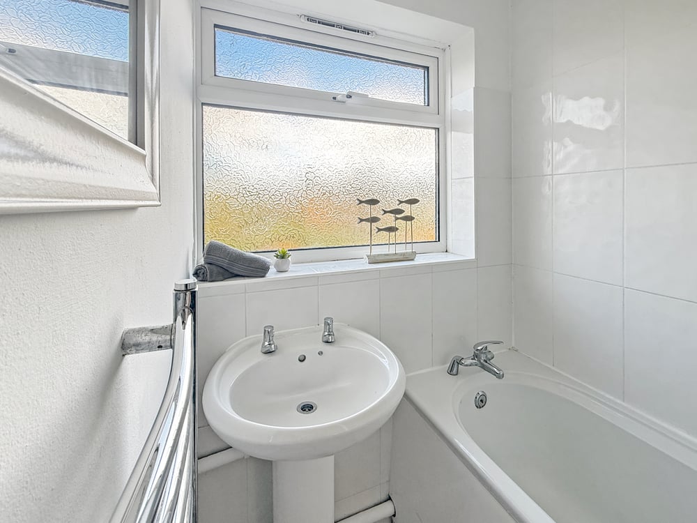 Double glazed obscure window to rear, paneled bath with over head shower, towel radiator, wash hand basin,